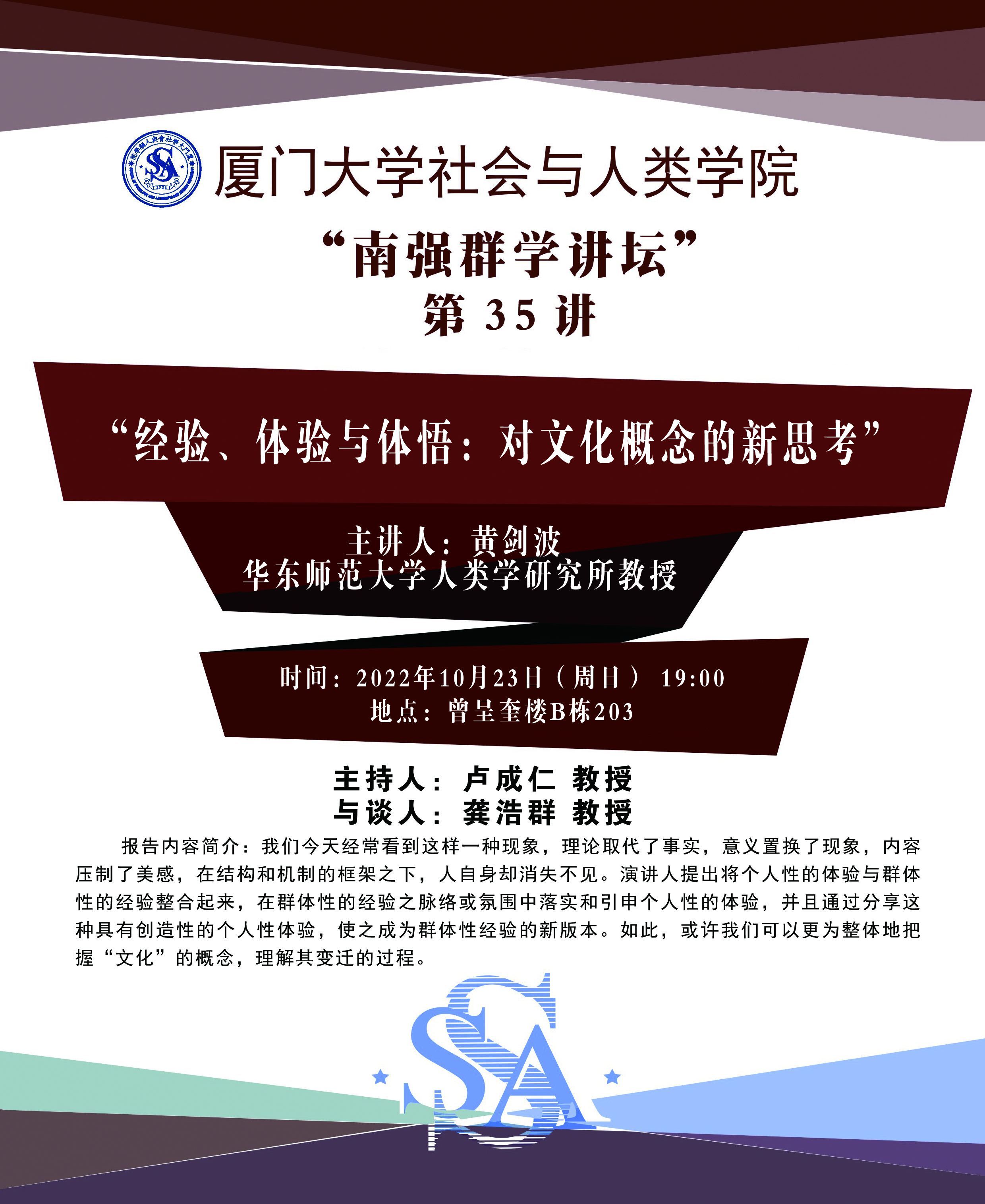 【南强群学讲坛】第35讲 “经验、体验与体悟:对文化概念的新思考” 2022年10月20日 点击:[] 主题:经验、体验与体悟:对文化概念的新思考主讲人:黄剑波 华东师范大学人类学研究所教授主持人:卢成仁 教授与谈人:龚浩群 教授时间:2022年10月23日(周日) 19:00地点:曾呈奎楼B栋203报告内容简介:我们今天经常看到这样一种现象,理论取代了事实,意义置换了现象,内容压制了美感,在结构和机制的框架之下,人自身却消失不见。演讲人提出将个人性的体验与群体性的经验整合起来,在群体性的经验之脉络或氛围中落实和引申个人性的体验,并且通过分享这种具有创造性的个人性体验,使之成为群体性经验的新版本。如此,或许我们可以更为整体地把握“文化”的概念,理解其变迁的过程。