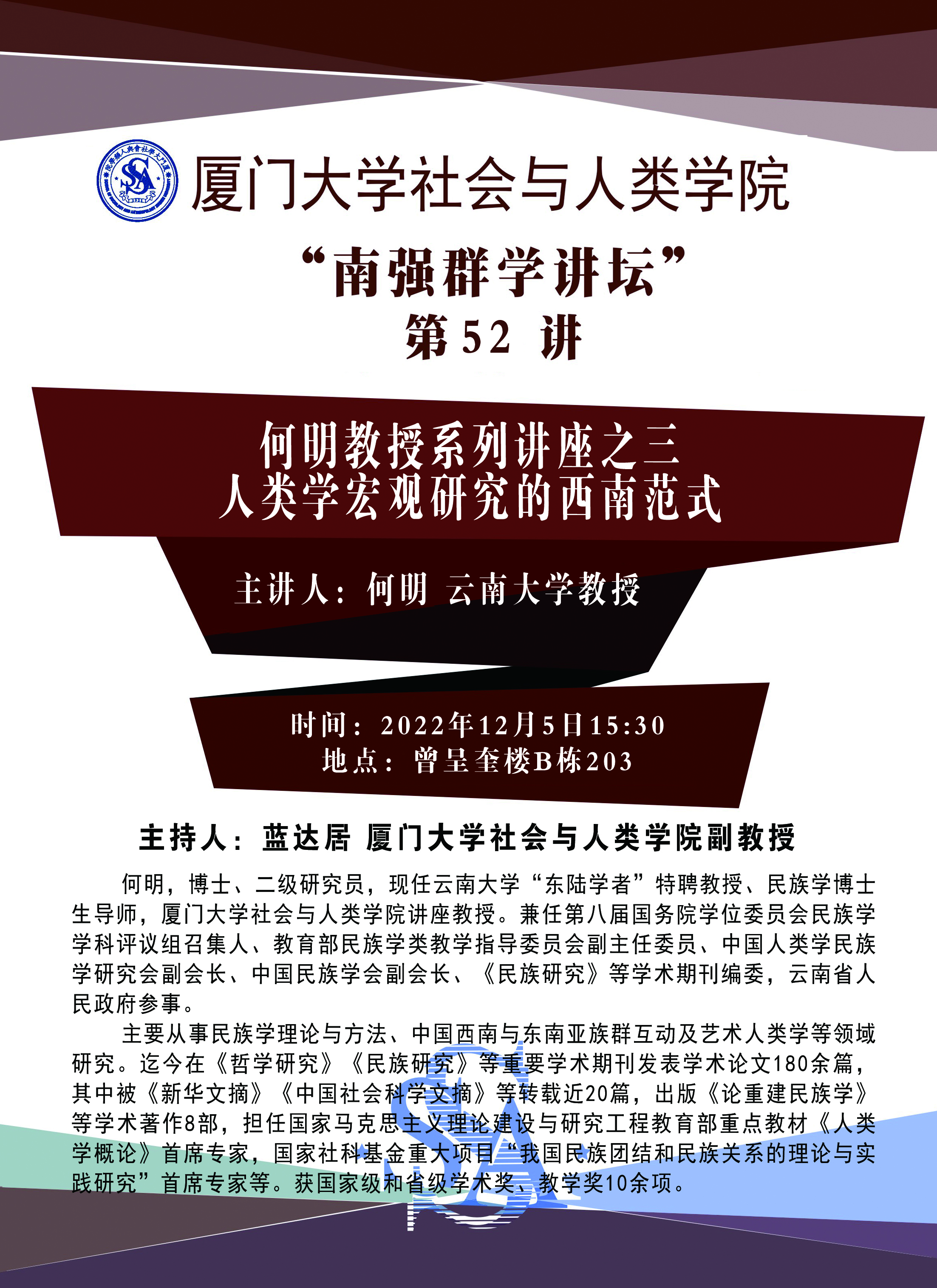 何明,博士、二级研究员,现任云南大学“东陆学者”特聘教授、民族学博士生导师,新太阳集团5493con讲座教授。兼任第八届国务院学位委员会民族学学科评议组召集人、教育部民族学类教学指导委员会副主任委员、中国人类学民族学研究会副会长、中国民族学会副会长、《民族研究》等学术期刊编委,云南省人民政府参事。