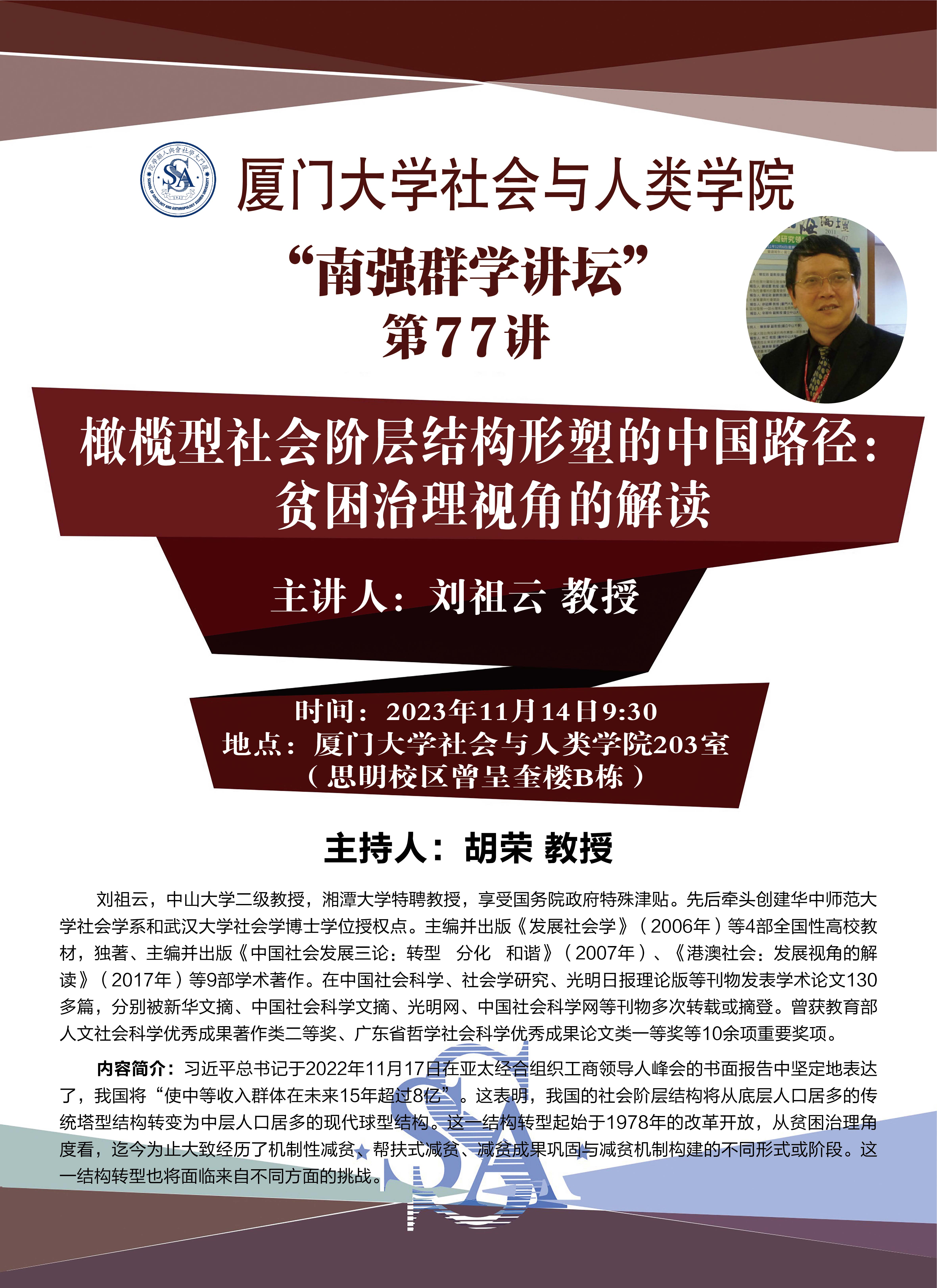 主讲人简介:刘祖云,中山大学二级教授,湘潭大学特聘教授,享受国务院政府特殊津贴。先后牵头创建华中师范大学社会学系和武汉大学社会学博士学位授权点。主编并出版《发展社会学》(2006年)等4部全国性高校教材,独著、主编并出版《中国社会发展三论:转型 分化 和谐》(2007年)、《港澳社会:发展视角的解读》(2017年)等9部学术著作。在中国社会科学、社会学研究、光明日报理论版等刊物发表学术论文130多篇,分别被新华文摘、中国社会科学文摘、光明网、中国社会科学网等刊物多次转载或摘登。曾获教育部人文社会科学优秀成果著作类二等奖、广东省哲学社会科学优秀成果论文类一等奖等10余项重要奖项。