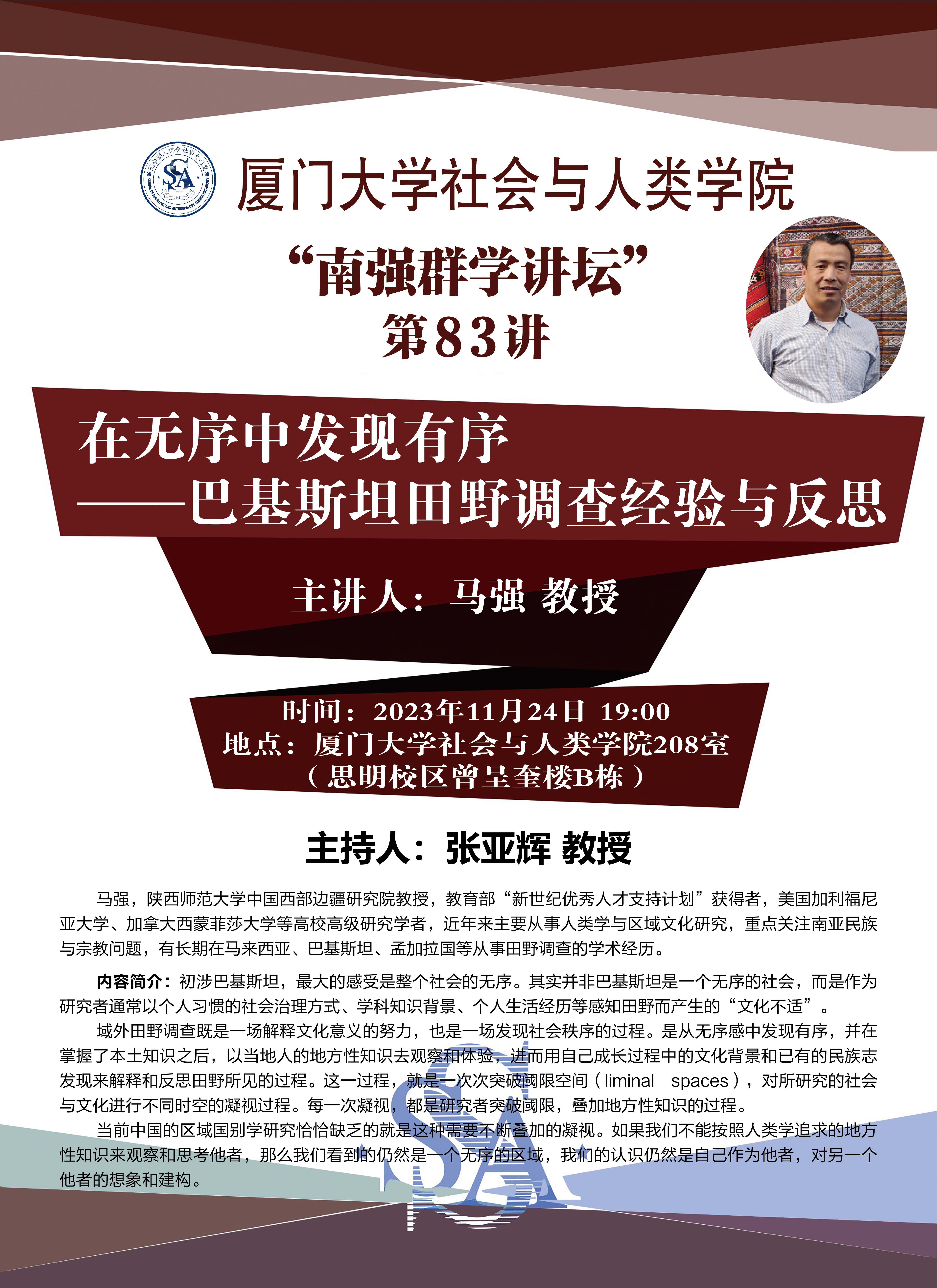 主讲人简介:马强,陕西师范大学中国西部边疆研究院教授,教育部“新世纪优秀人才支持计划”获得者,美国加利福尼亚大学、加拿大西蒙菲莎大学等高校高级研究学者,近年来主要从事人类学与区域文化研究,重点关注南亚民族与宗教问题,有长期在马来西亚、巴基斯坦、孟加拉国等从事田野调查的学术经历。