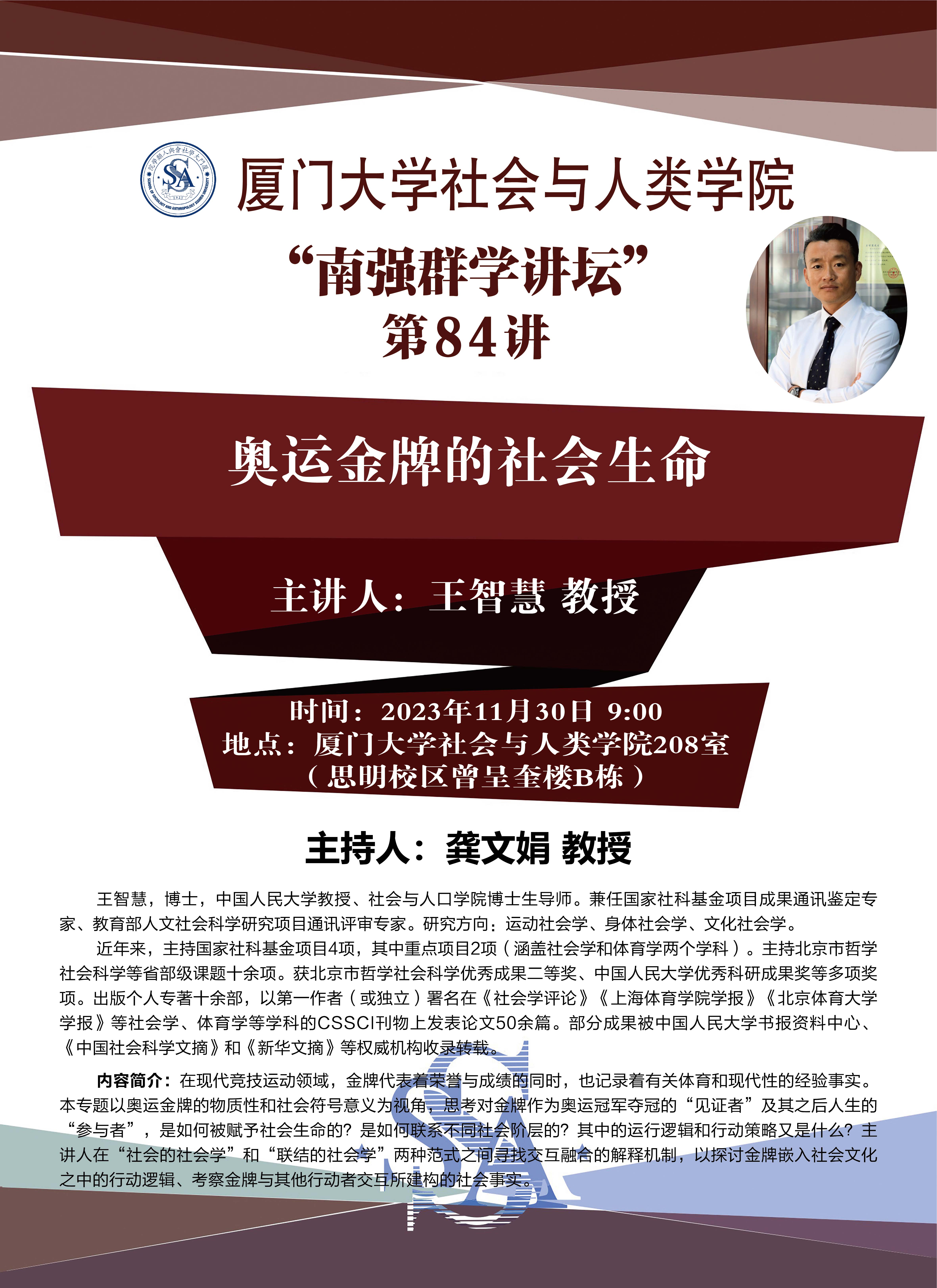 主讲人简介:王智慧,博士,中国人民大学教授、社会与人口学院博士生导师。兼任国家社科基金项目成果通讯鉴定专家、教育部人文社会科学研究项目通讯评审专家。研究方向:运动社会学、身体社会学、文化社会学。
