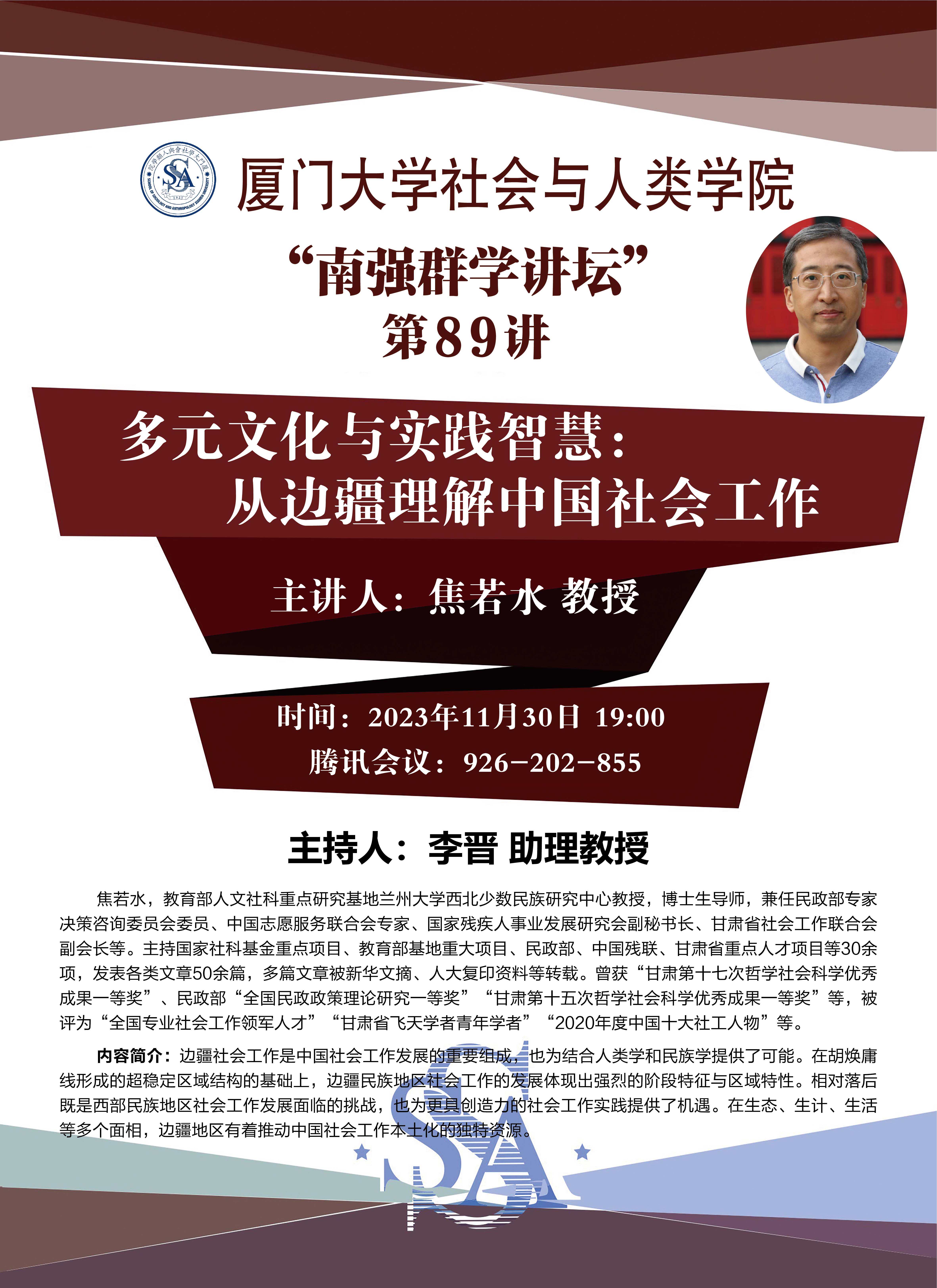 主讲人简介:焦若水,教育部人文社科重点研究基地兰州大学西北少数民族研究中心教授,博士生导师,兼任民政部专家决策咨询委员会委员、中国志愿服务联合会专家、国家残疾人事业发展研究会副秘书长、甘肃省社会工作联合会副会长等。主持国家社科基金重点项目、教育部基地重大项目、民政部、中国残联、甘肃省重点人才项目等30余项,发表各类文章50余篇,多篇文章被新华文摘、人大复印资料等转载。曾获“甘肃第十七次哲学社会科学优秀成果一等奖”、民政部“全国民政政策理论研究一等奖”“甘肃第十五次哲学社会科学优秀成果一等奖”等,被评为“全国专业社会工作领军人才”“甘肃省飞天学者青年学者”“2020年度中国十大社工人物”等。