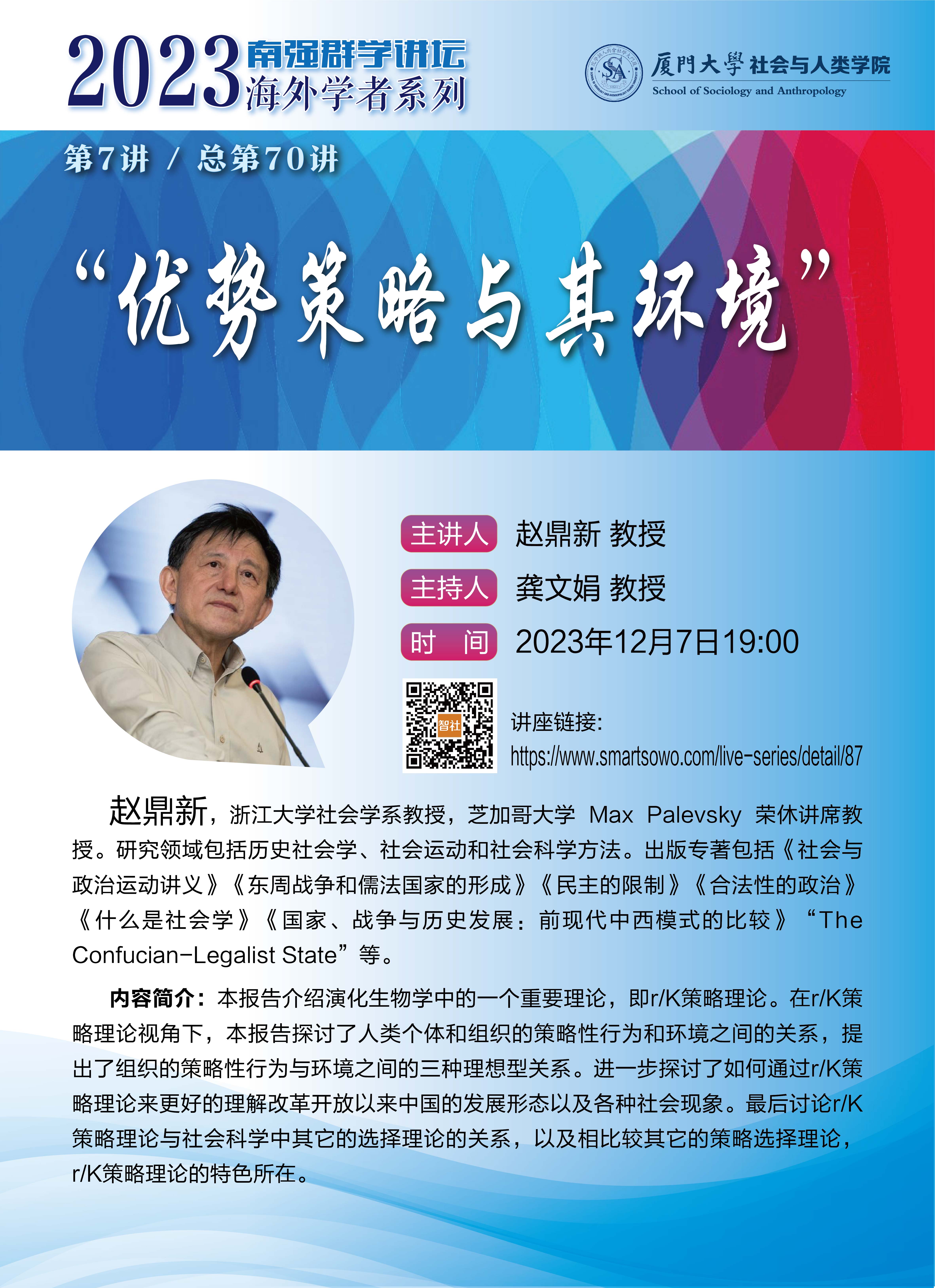 主讲人简介:赵鼎新,浙江大学社会学系教授,芝加哥大学 Max Palevsky 荣休讲席教授。研究领域包括历史社会学、社会运动和社会科学方法。出版专著包括《社会与政治运动讲义》《东周战争和儒法国家的形成》《民主的限制》《合法性的政治》《什么是社会学》《国家、战争与历史发展:前现代中西模式的比较》“The Confucian-Legalist State”等。