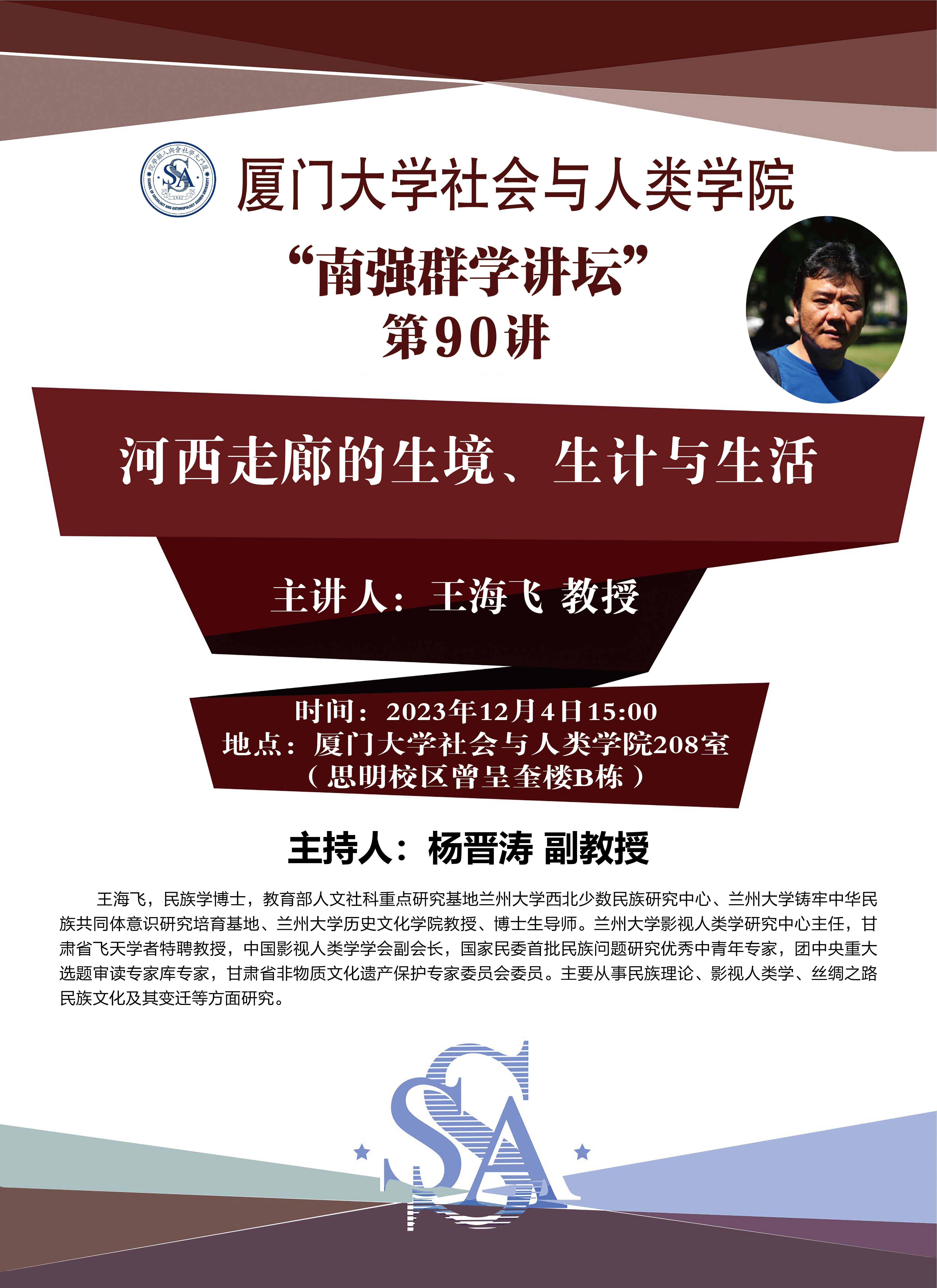 【南强群学讲坛】第90讲“河西走廊的生境、生计与生活” 2023年12月04日 点击:[] 主题:河西走廊的生境、生计与生活主讲人:王海飞 教授主持人:杨晋涛 副教授时间:2023年12月4日 15:00地点:新太阳集团5493con208室(思明校区曾呈奎楼B栋)主讲人简介:王海飞,民族学博士,教育部人文社科重点研究基地兰州大学西北少数民族研究中心、兰州大学铸牢中华民族共同体意识研究培育基地、兰州大学历史文化学院教授、博士生导师。兰州大学影视人类学研究中心主任,甘肃省飞天学者特聘教授,中国影视人类学学会副会长,国家民委首批民族问题研究优秀中青年专家,团中央重大选题审读专家库专家,甘肃省非物质文化遗产保护专家委员会委员。主要从事民族理论、影视人类学、丝绸之路民族文化及其变迁等方面研究。