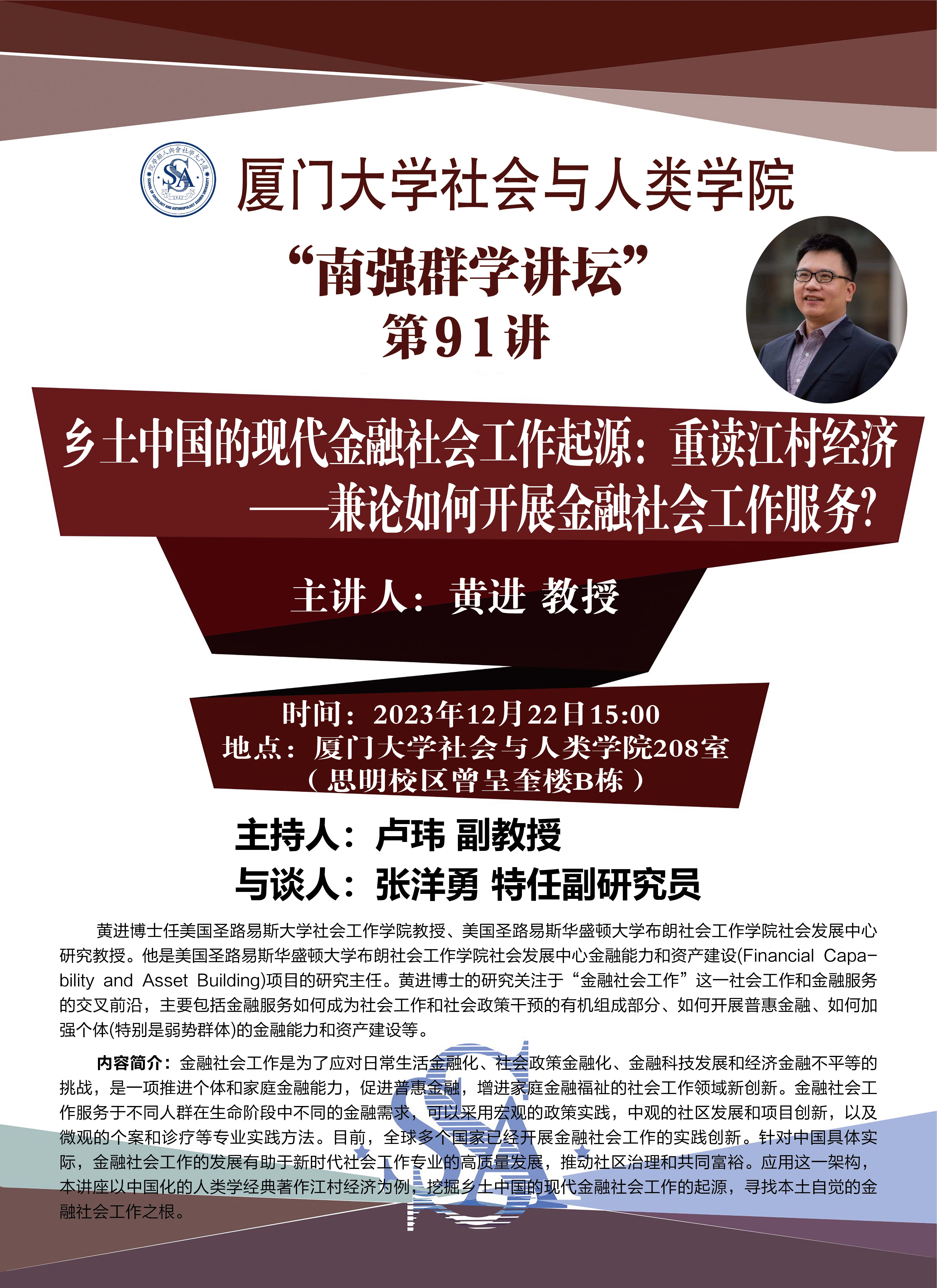 讲座内容简介:金融社会工作是为了应对日常生活金融化、社会政策金融化、金融科技发展和经济金融不平等的挑战,是一项推进个体和家庭金融能力,促进普惠金融,增进家庭金融福祉的社会工作领域新创新。金融社会工作服务于不同人群在生命阶段中不同的金融需求,可以采用宏观的政策实践,中观的社区发展和项目创新,以及微观的个案和诊疗等专业实践方法。目前,全球多个国家已经开展金融社会工作的实践创新。针对中国具体实际,金融社会工作的发展有助于新时代社会工作专业的高质量发展,推动社区治理和共同富裕。应用这一架构,本讲座以中国化的人类学经典著作江村经济为例,挖掘乡土中国的现代金融社会工作的起源,寻找本土自觉的金融社会工作之根。