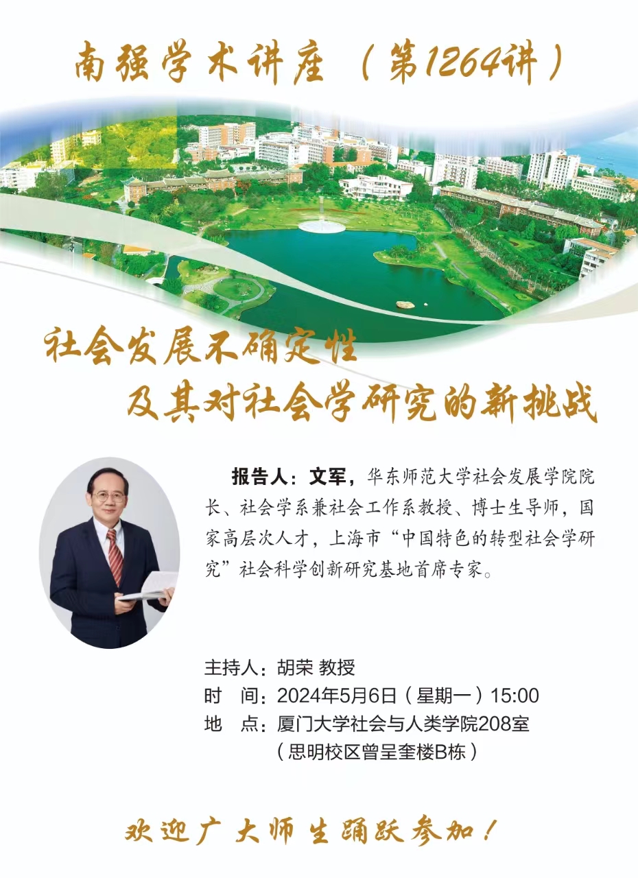 南强学术讲座第1264讲 | 社会发展不确定性及其对社会学研究的新挑战 2024年04月28日 点击:[] 报告人:文军,华东师范大学社会发展学院院长、社会学系兼社会工作系教授、博士生导师,国家高层次人才,上海市“中国特色的转型社会学研究”社会科学创新研究基地首席专家。报告题目:社会发展不确定性及其对社会学研究的新挑战时 间:2024年5月6日15:00主 持 人:胡荣 教授地 点:新太阳集团5493con208室(思明校区曾呈奎楼B栋)