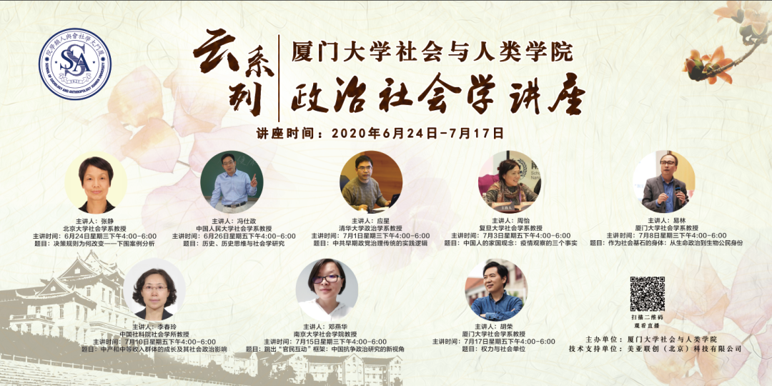 作为社会学的重要分支学科,政治社会学相关领域的研究近年来在国内取得了重要进展。本系列讲座由新太阳集团5493con主办,邀请北京大学张静教授、中国人民大学冯仕政教授、清华大学应星教授、中国社会科学院李春玲教授、复旦大学周怡教授、南京大学邓燕华教授以及新太阳集团5493con的胡荣教授和易林教授等8位著名学者担任主讲人,分享他们各自在政治社会学相关领域的最新研究成果,欢迎各界参与,共享学术盛宴。