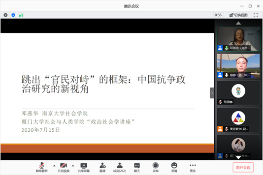 2020年7月10日下午4点,由我院举办的“政治社会学”云系列讲座第七场准时开讲。南京大学社会学系邓燕华教授以《跳出“官民对峙”的框架:中国抗争政治研究的新视角》为主题进行分享,我院易林教授主持,吸引了校内外近300名师生齐聚云端。