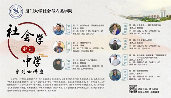 7月30日,我院为广大中学生们精心打造的“社会学走进中学”系列云讲座顺利落下帷幕。作为国内首家面向中学生举行学术讲座的学院,我院精心设计、精准发力、精益求精,在7月21日至30日的10天时间里,共组织了7场主题不同、内容丰富的讲座,带领中学生观众们走进社会学、了解社会学。