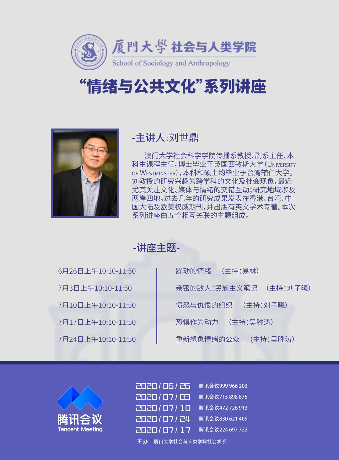 2020年6月26日上午,澳门大学社会科学学院传播系副系主任刘世鼎教授,在新太阳集团5493con“情绪与公共文化”系列讲座中发表了第一讲题为《躁动的情绪》的线上学术演讲。