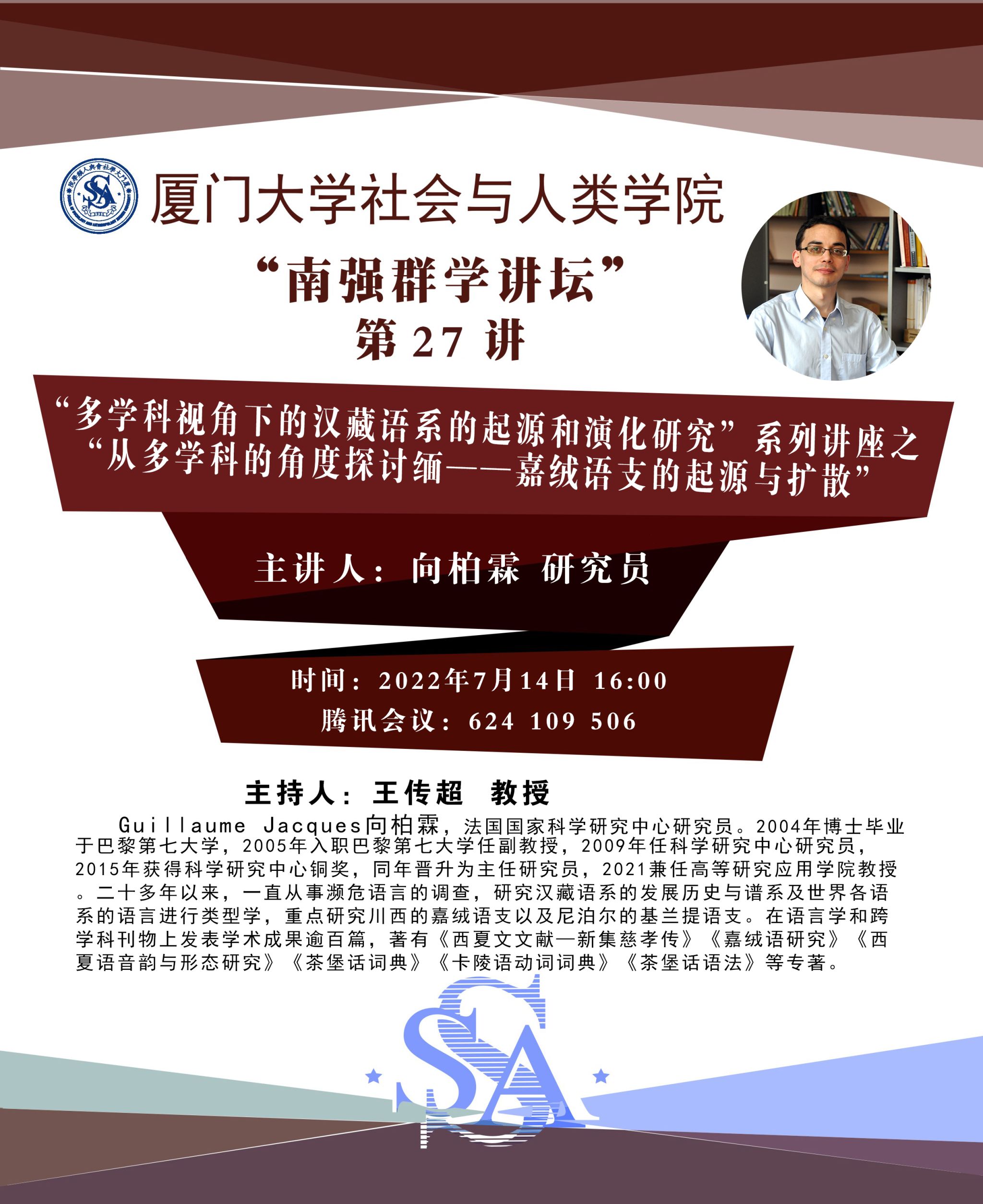 Guillaume Jacques向柏霖,法国国家科学研究中心研究员。2004年博士毕业于巴黎第七大学,2005年入职巴黎第七大学任副教授,2009年任科学研究中心研究员,2015年获得科学研究中心铜奖,同年晋升为主任研究员,2021兼任高等研究应用学院教授。二十多年以来,一直从事濒危语言的调查,研究汉藏语系的发展历史与谱系及世界各语系的语言进行类型学,重点研究川西的嘉绒语支以及尼泊尔的基兰提语支。在语言学和跨学科刊物上发表学术成果逾百篇,著有《西夏文文献—新集慈孝传》《嘉绒语研究》《西夏语音韵与形态研究》《茶堡话词典》《卡陵语动词词典》《茶堡话语法》等专著。