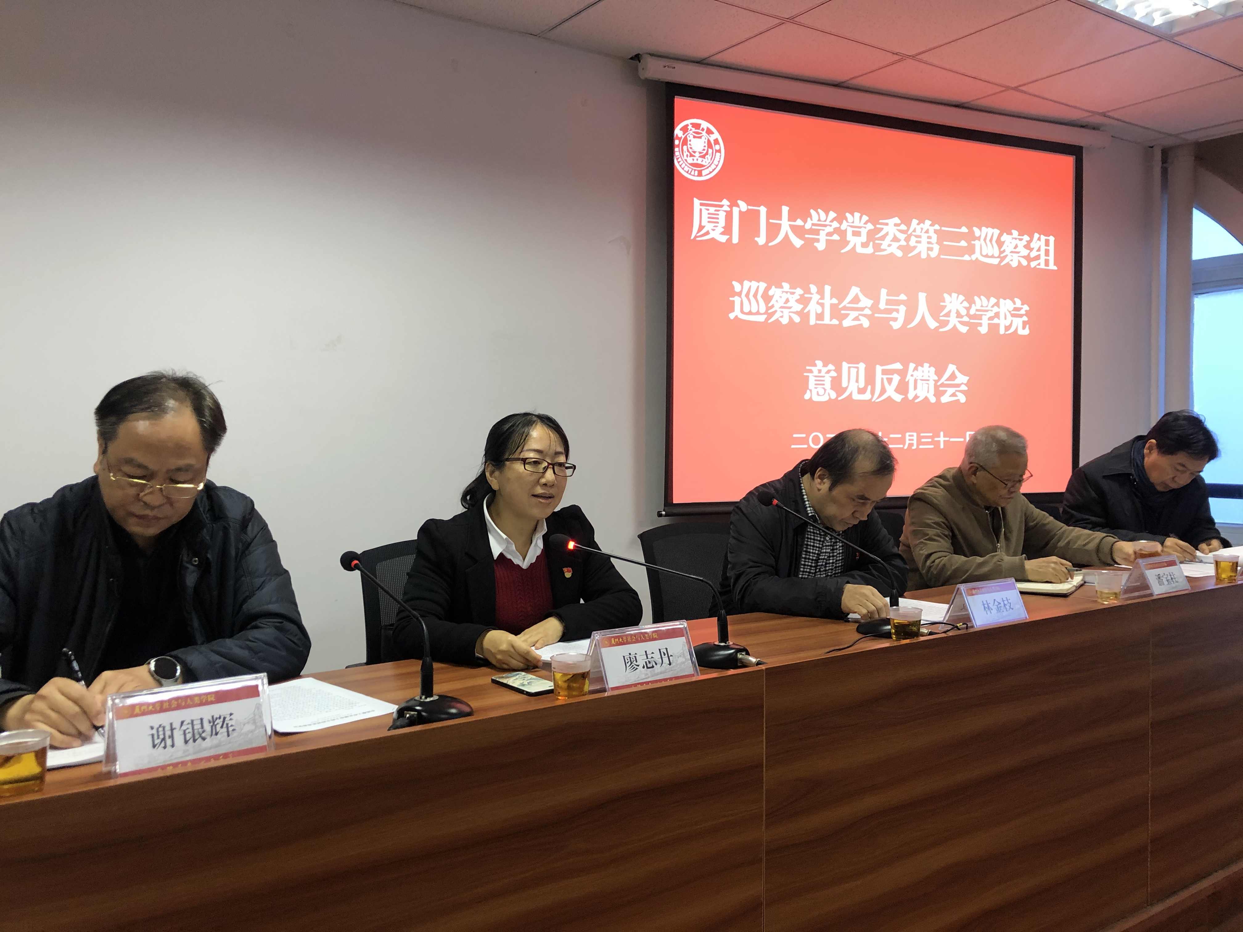 12月31日上午,校党委第五轮巡察第三巡察组巡察社会与人类学院意见反馈会在学院203室召开。校纪委副书记、纪委办主任、巡察办主任林金枝,校党委党建办主任、组织部副部长、教师工作部副部长、第三巡察组组长廖志丹,巡察组副组长、化学化工学院党委原副书记潘宝柱、学校基层党建联络员、软件学院原党委书记杨敬达等出席会议。会议由学院党委书记谢银辉主持,学院全体在职教职工参加会议。