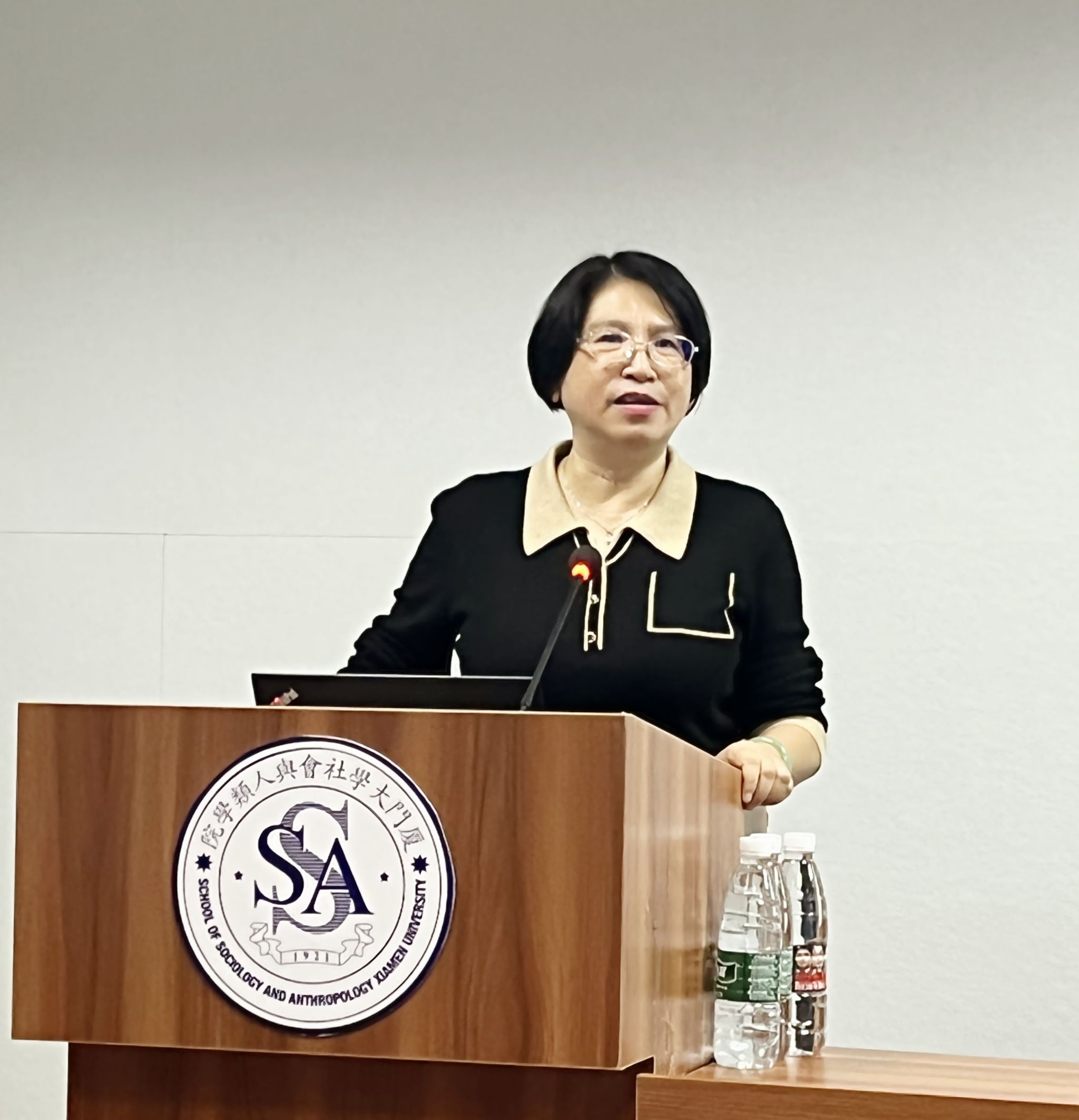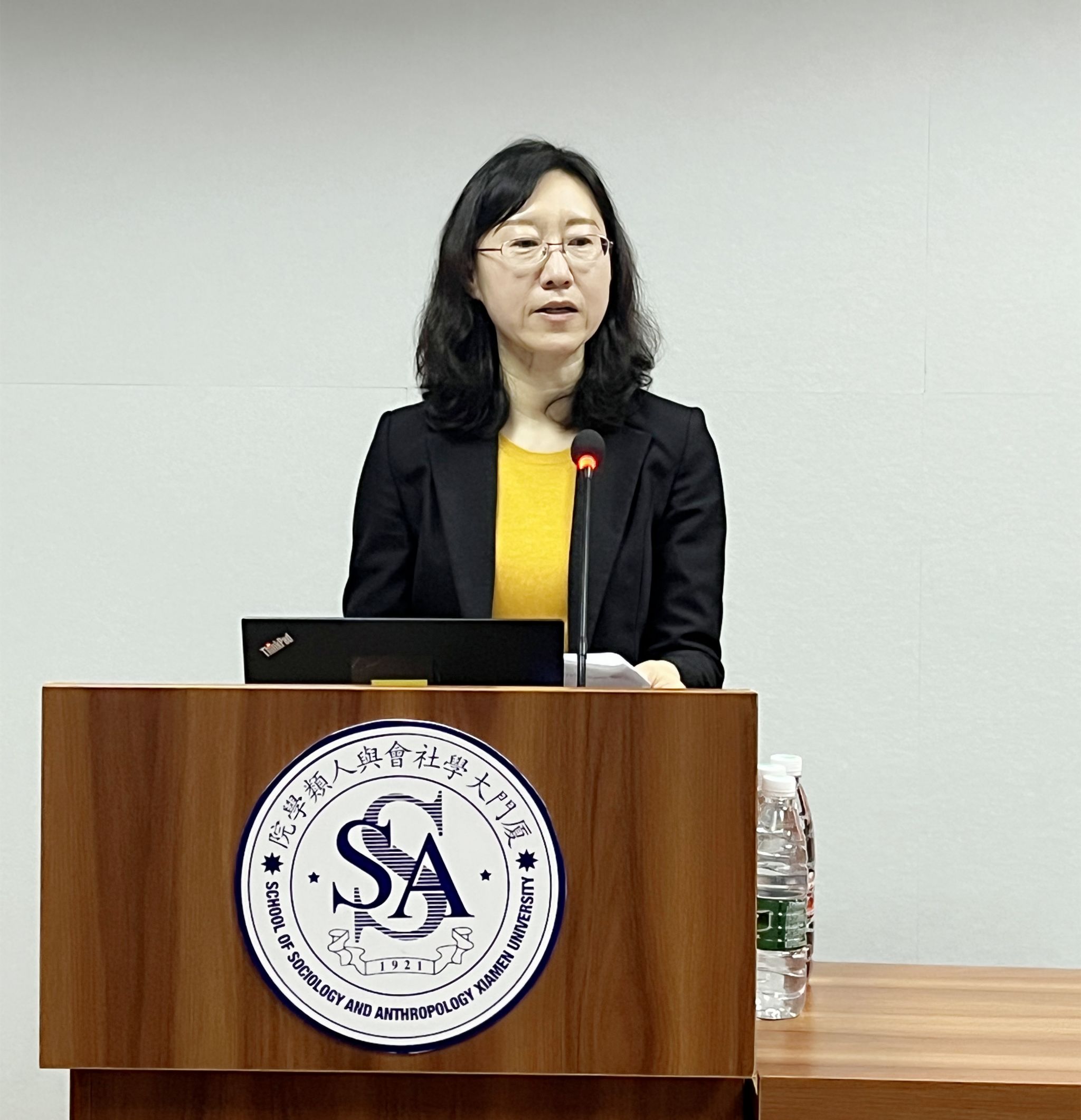 学习会上,学院院长胡荣教授为何丽新教授颁发学院南强群学讲坛纪念牌。