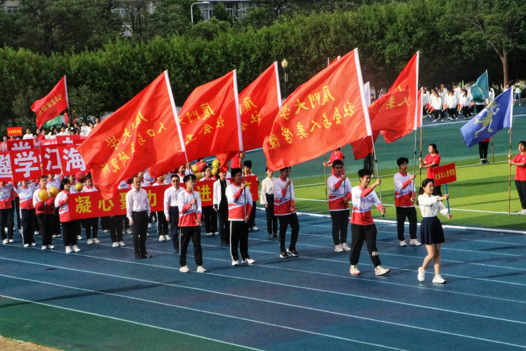 我院党委副书记陈夷老师、毛毛老师,团委书记王安胜老师,辅导员冉丽莎老师组成的教职工代表,与同学们一起在“学海洋洋,鹭江深长;社会有我,人类自强”的口号声中迈步向前。他们手中所持的红色与金色气球,寄寓着“贯彻党的二十大,奋进新征程”的坚定信念。队伍前的横幅标语“凝心聚力,奋进一流”则表达了我院师生团结奋斗、建设一流学科的坚定决心。时代的号角、蓬勃的活力、年轻的面孔,共同谱出新时代青年学子与社会学科建设的优美乐章。