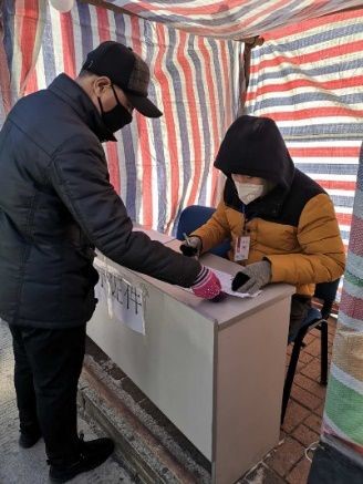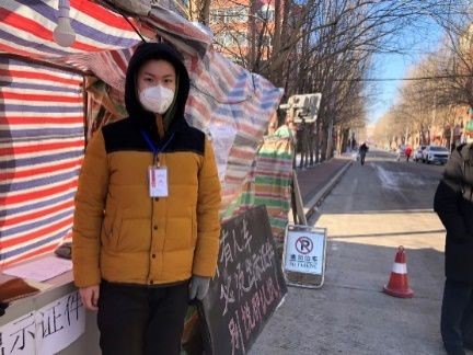 支部预备党员2016级本科生郑翰阳同志积极回到家乡所在的黑龙江省哈尔滨市巴彦县兴隆林业局社区报到,经社区批准成为一名疫情防控志愿者,投身到疫情防控的第一线。大雪纷飞的街道,郑翰阳同志与社区工作人员一起在卡点处把守路口,对过往行人进行消毒、测体温、登记。郑翰阳同志感叹道:“疫情防控阻击战正处在关键时刻,若每个人都能多承担一点,这场防疫战的胜利就将更快到来!”