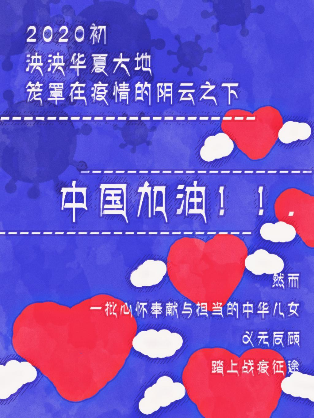 新型冠状肺炎暴发,阴云笼罩中国,而阴云之下的中国人民并未就此恐惧或退缩,反而拿起武器,坚定地吹响了战“疫”号角。大家同心协力,共战疫情,积极行动。中国加油!加油!这是我们发自内心的呼喊。