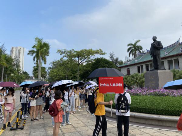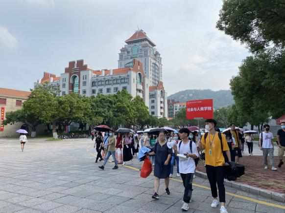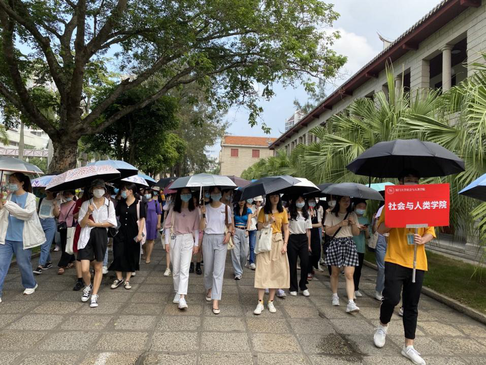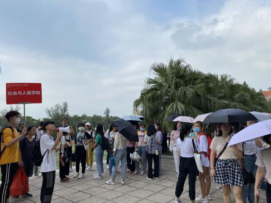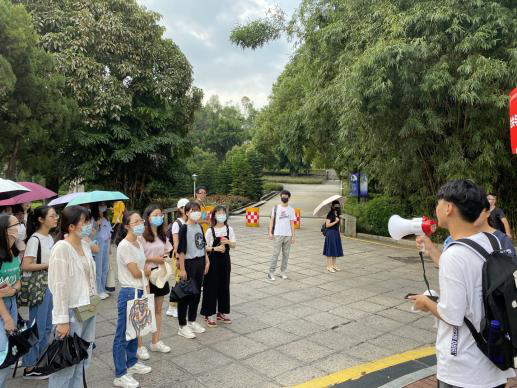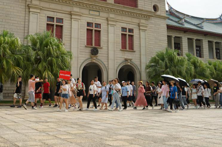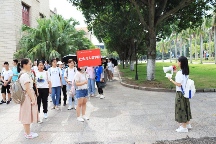 从群贤校门出发,研究生新生们依次经过校革命纪念馆、嘉庚像、科学艺术中心、颂恩楼、芙蓉隧道等标志性建筑,志愿者为同学们讲解校主陈嘉庚先生、罗扬才烈士、萨本栋校长、王亚南校长和陈景润学长的故事,带领新生学习了爱国、革命、自强和科学的厦大精神。