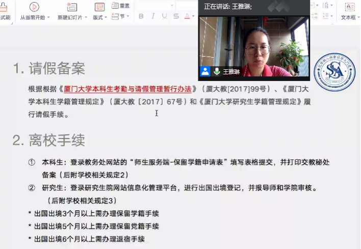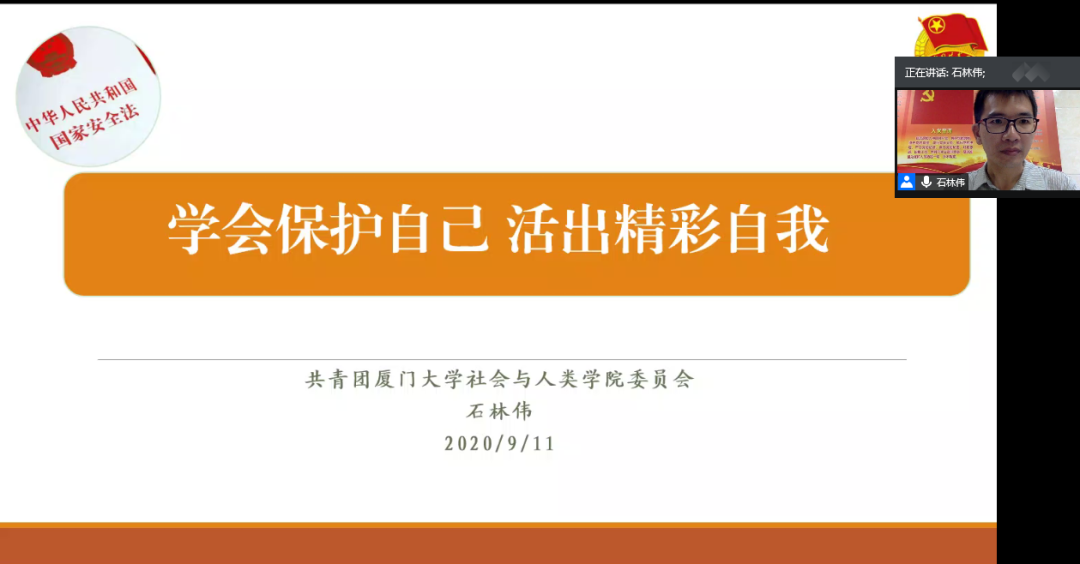 下午3点,新生们参与了线上举行的“学生管理制度”会议,学院党务秘书刘美君老师、团委书记石林伟老师、本科生教学秘书王雅琳老师和辅导员冉丽莎老师分别围绕入党流程、国家安全观,出国出境管理、奖勤助贷医补政策、学生日常管理规定等主题进行了相关介绍。