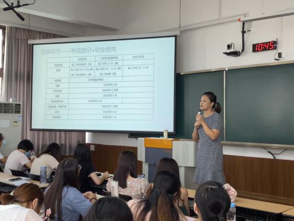 上午十时许,在庄汉水楼(南强二)教室,研究生教学秘书张灵老师为新生们介绍研究生教学工作的相关安排,对学籍管理、课程安排、培养方案、国(境)内外交流机会的相关内容进行了讲解。