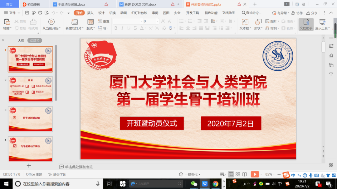 为打造一支政治觉悟高、思想品德正、感召能力强、业务能力精的学生骨干队伍,提高学生组织的力量,促进我院学生工作的和谐发展,社会与人类学院第一届学生骨干培训班开班暨动员仪式于2020年7月2日举行,本次活动的主题为“激扬青春活力·献礼百年校庆”,号召我院学生工骨干用热爱与责任筑牢学生工作的四梁八柱,将青春与热血献礼百年校庆。