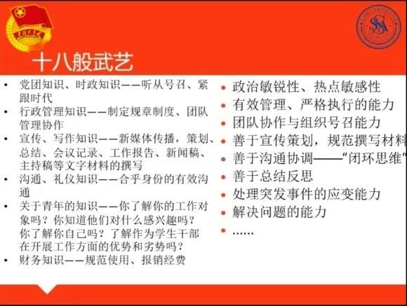更进一步,学生干部需要拥有四种能力:一是奉献,要以做事业的心态来经营学生工作;二是合作,在合作性团队中要积极主动、相互信任、高效沟通;三是积极,去用心洞悉世界、用心经营自己;四是宽容,在团队中以宽容的心态相处协作。除此之外,学生干部还要学会"十八般武艺",在学习中培养敏锐度,提高沟通、总结、应变、解决问题等多方面的能力。