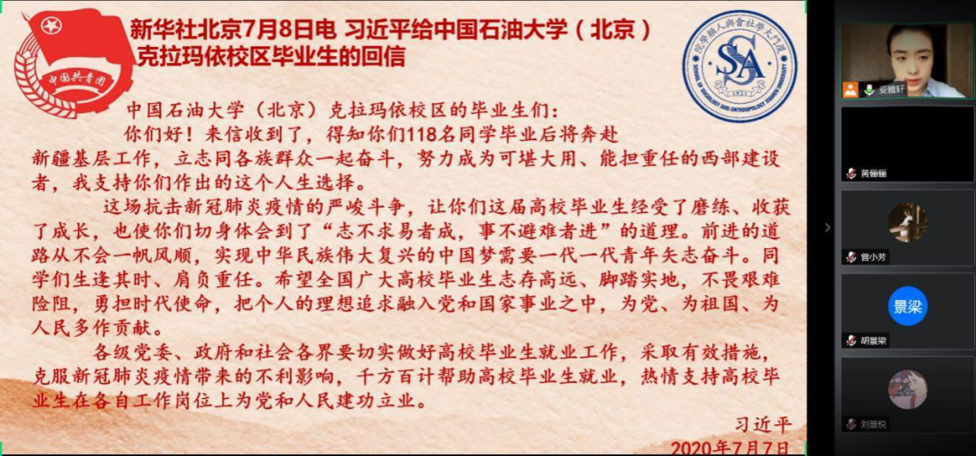 会议伊始,主持人领读了《习近平给中国石油大学(北京)克拉玛依校区毕业生的回信》。在信中,习近平总书记鼓励全国广大高校毕业生要志存高远、脚踏实地,不畏艰难险阻,勇担时代使命,把个人理想追求融入到党和国家事业中。