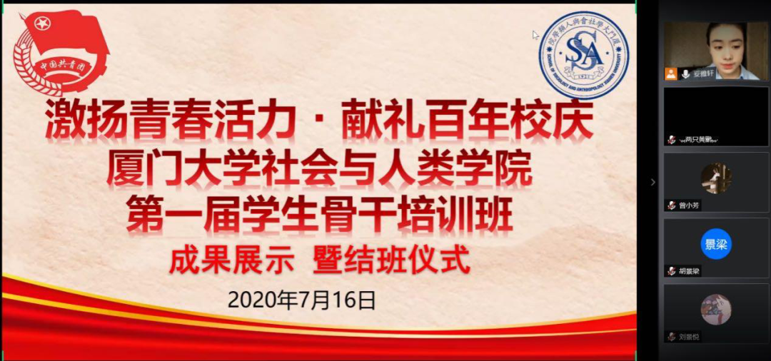 7月16日中午,社会与人类学院“激扬青春活力·献礼百年校庆”第一届学生骨干培训班成果展示暨结班仪式在线上顺利召开。