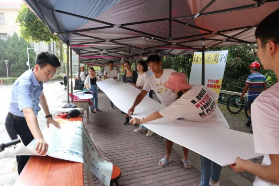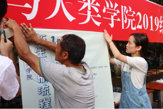 报到注册的前一天,志愿者们对注册现场进行了布置,学院领导和老师也亲临现场指导工作。志愿者们积极配合,摆放桌椅、搭建合影版、张贴横幅,忙得不亦乐乎。虽然九月的厦门骄阳似火,可一想到今天就将见到小可爱们,他们个个都干劲十足!