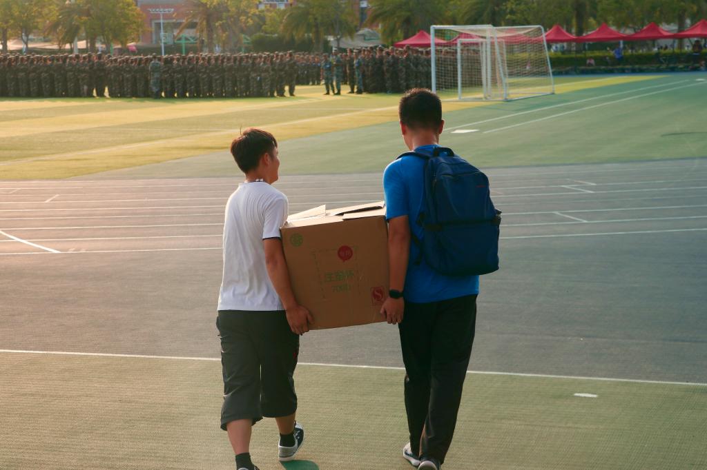 在军训慰问活动的开场,本科生团总支和学生会的学生干部们将慰问品分发给新生们。