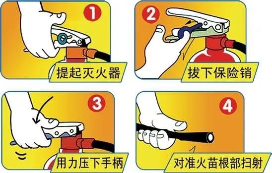 4.保持安全距离(距离火源约2-3米),左手扶喷管,喷嘴对准火焰根部,右手用力,压下压把