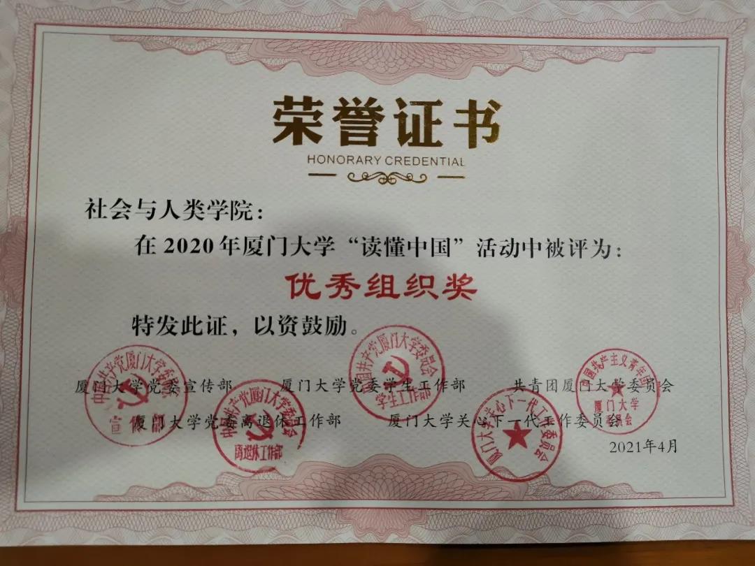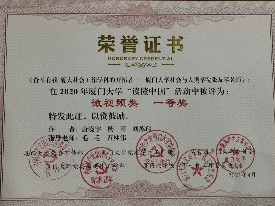 我院学生唐晓宇、杨雨、刘苏玮在党委副书记毛毛老师、团委书记石林伟老师的指导下,创作的微视频作品《奋斗有我,厦大社会工作学科的开拓者——新太阳集团5493con张友琴老师》荣获2020年新太阳集团5493con“读懂中国”活动微视频类一等奖,我院荣获优秀组织奖。