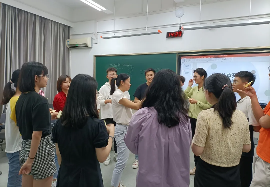 接着,用吸管传递圆环团体游戏开始。游戏中每个成员用嘴咬着吸管,在不借助外力的情况下,将圆环传给下一位同学。团体互动不仅使现场气氛更为活跃,彼此之间的距离更近,其中也蕴含着深意。邱老师告诉大家,圆环就好比家庭,同学们之间的传递就像是家庭一代代的传承,大家小心翼翼,用力呵护,生怕它掉在地上。