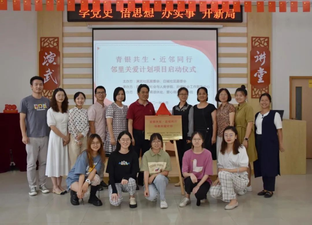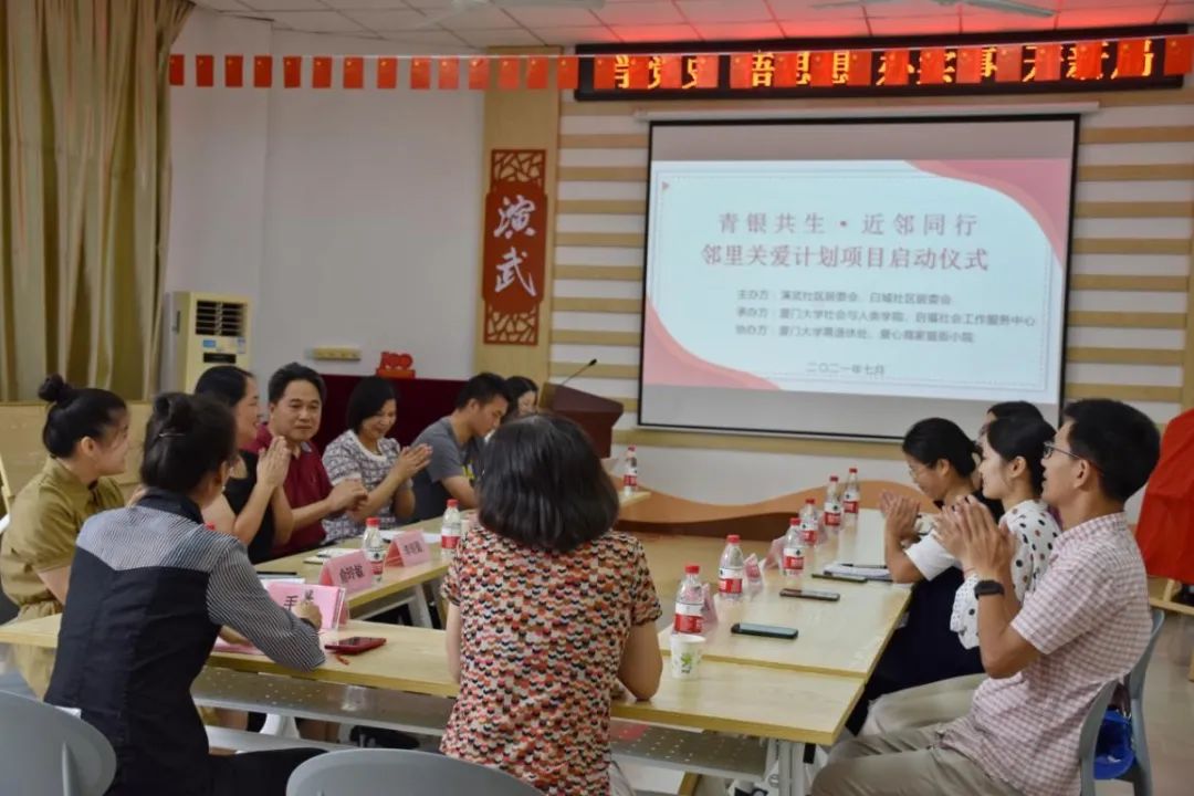 2021年7月13日上午,由厦门市演武社区、白城社区、新太阳集团5493con、新太阳集团5493con离退休处、厦门市启福社会工作服务中心、猫街小院共同打造的“青银共生·近邻同行”邻里关爱计划项目启动仪式在演武新时代文明实践站举办。演武社区党总支书记张丹晖、白城社区党委书记李晓勤、新太阳集团5493con离退休处副处长周一钦、新太阳集团5493con党委副书记毛毛、社会工作系副系主任魏爱棠教授、团委书记石林伟、辅导员冉丽莎、社工实习督导徐蕾、启福社会工作服务中心主任俞玲敏、实习生和新太阳集团5493con志愿者代表参与了项目启动仪式。仪式由俞玲敏主持。