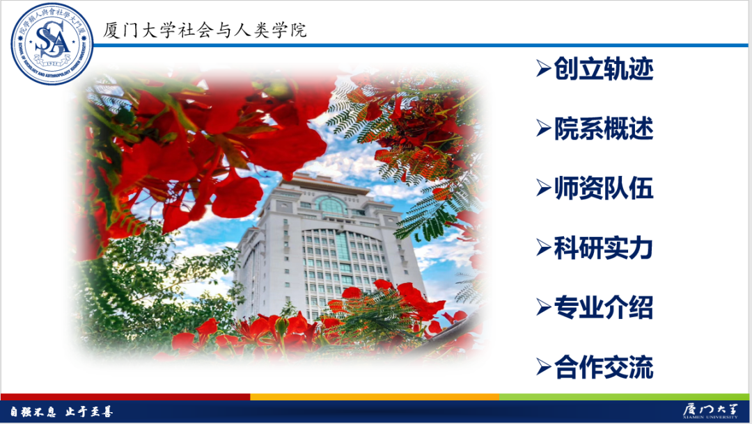 学院副院长徐延辉教授从社会与人类学院创立轨迹、院系概述、师资队伍、科研实力、专业介绍、合作交流等方面向营员详细介绍了学院概况。首先,徐延辉教授图文并茂地从学院创立轨迹方面,向大家介绍了自1921年社会学系设立到2019年社会与人类学院正式成立的发展过程,并在院系概述方面,介绍了我院社会学系、人类学与民族学系、社会工作系、人类学研究所、人口与生态研究所的专业设置、专任教师和学生规模;接着,徐老师从师资队伍方面介绍了我院高水平师资力量和国际化师资队伍的情况;并从科研课题、科研论文、科研获奖等方面向营员介绍了我院的科研实力;最后,在专业介绍方面,徐老师从学院各个专业的研究方向及团队、培养目标、主要课程几个方面进行了详细讲解;此外,徐延辉教授还对各位营员感兴趣的毕业生就业去向、国际交流合作以及学校概貌等相关问题进行了详细解答。