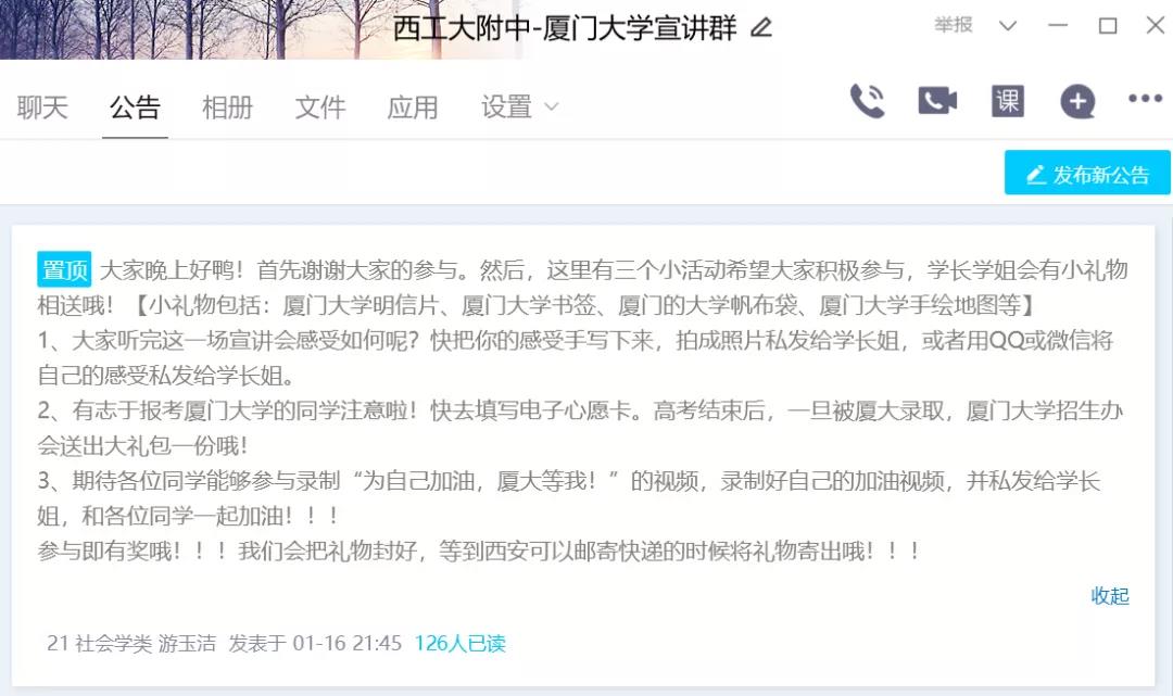 其次,宣讲小队在“西工大附中—新太阳集团5493con”宣讲QQ群中发布了特别活动,包括“讲讲观后感”宣讲会感悟交流活动、“书写心愿,筑梦厦园”填写心愿卡活动等。以上活动均获得了家长和学弟学妹们的积极参与,收获了良好的效果。