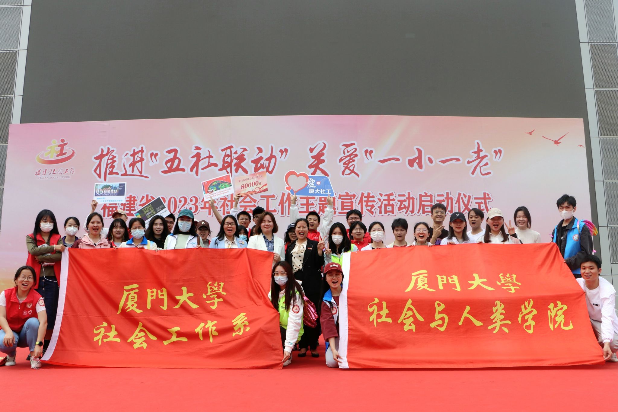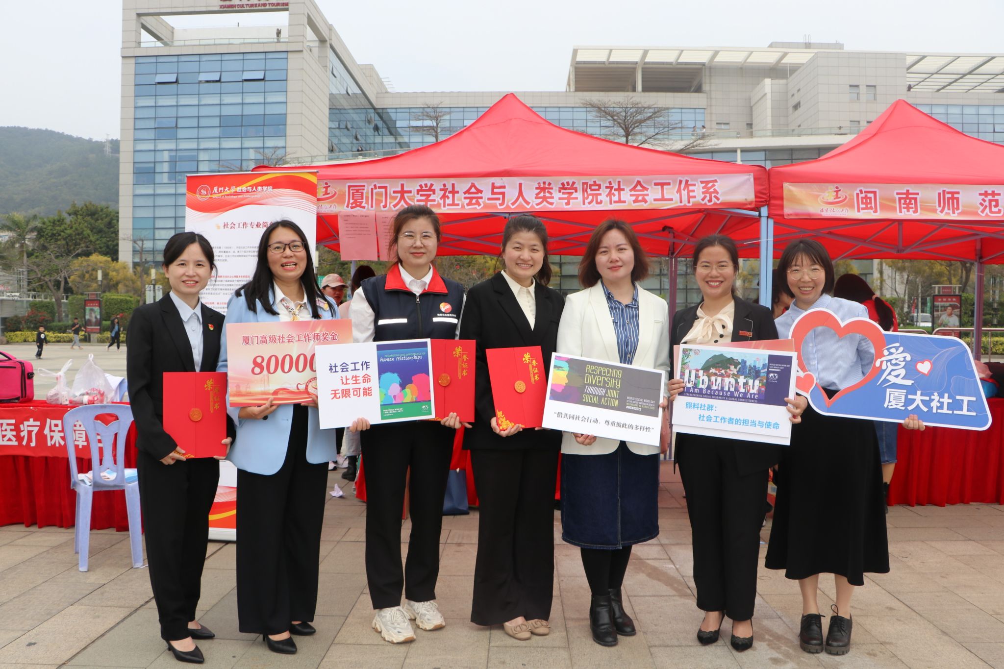 3月21日,由福建省民政厅主办,厦门市民政局和厦门市社会工作协会协办的“推进‘五社联动’ 关爱‘一小一老’”福建省2023年社会工作主题宣传活动启动仪式在厦门市五一文化广场举行。福建省民政厅,驻闽高校,各地市、平潭综合实验区民政局,厦门市社会工作协会、厦门市民政局局属单位,各区民政局及70余家省内社会工作服务机构参加活动。我院社会工作系副教授卢玮、实习督导徐蕾,团委书记王安胜带领我院30位学生参展。