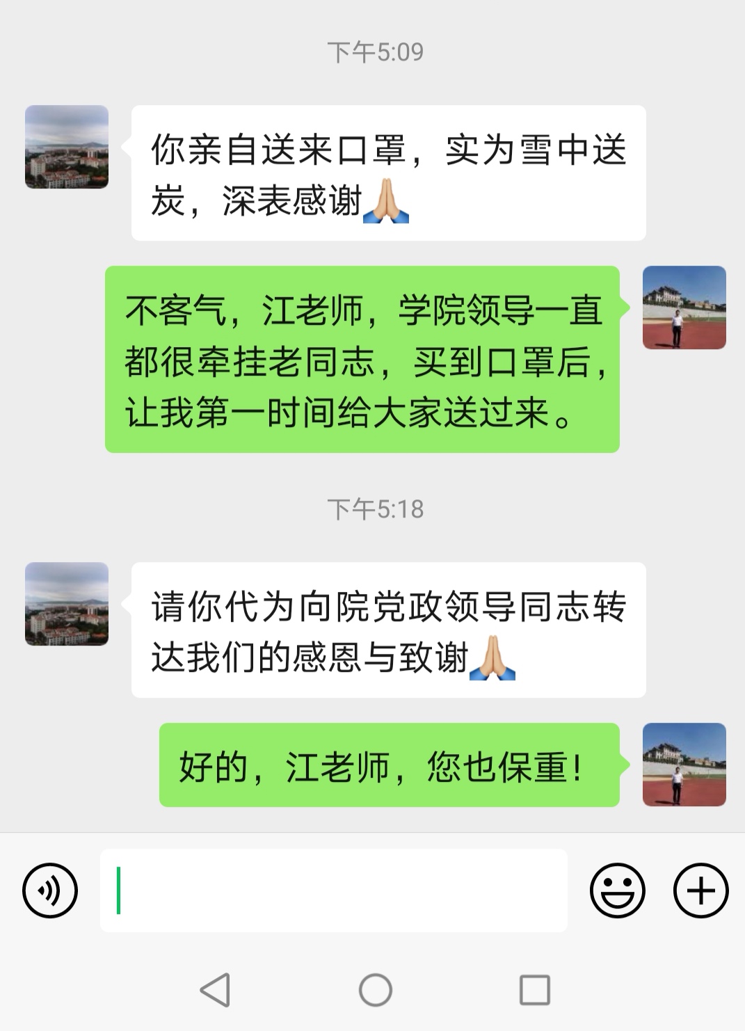 学院特别关注退休老同志群体,疫情暴发后,学院第一时间拨通每一位退休老同志电话,告知预防新型肺炎的健康知识,并多次主动关心其生活及其他方面的困难和需求,特别是在预防新型肺炎方面的需求。口罩等物资到院后,为避交叉感染,办公室主任廖晓波独自一人驾车将物资送到每一位老同志手中。收到口罩后,老同志饱含深情,激动地说:“谢谢!感谢学院在困难时期还能想起我们这些老同志。”口罩虽轻,情谊却重;物资虽少,关爱却真。他们的每一声“感谢”、每一句“感恩”无不表达了对学院给予老同志真情、真心、真爱的肯定,正所谓疫情无情人有情、“雪中送炭”见真情。