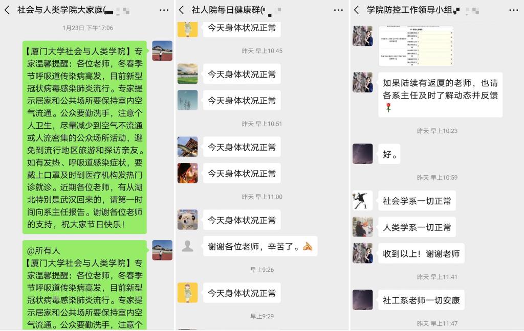 学院采用网格化管理模式,建立每日信息报送制度,密切监控师生健康状况,层层抓落实,对师生健康情况做好“日报告”;辅导员深入学生宿舍,全方位了解留校学生的学习生活情况,实现联系全覆盖和保持经常性联系;学院及时响应各级党团组织号召,成立党(团)员服务队,依托本科生党支部成立“社会与人类学院本科生党员服务队”,重点关注、点对点联系在湖北特别是武汉逗留过的师生及亲属,通过电话、微信等方式,对他们表示亲切的慰问,了解他们的健康情况和面临困难,给他们送去及时的温暖和关怀。