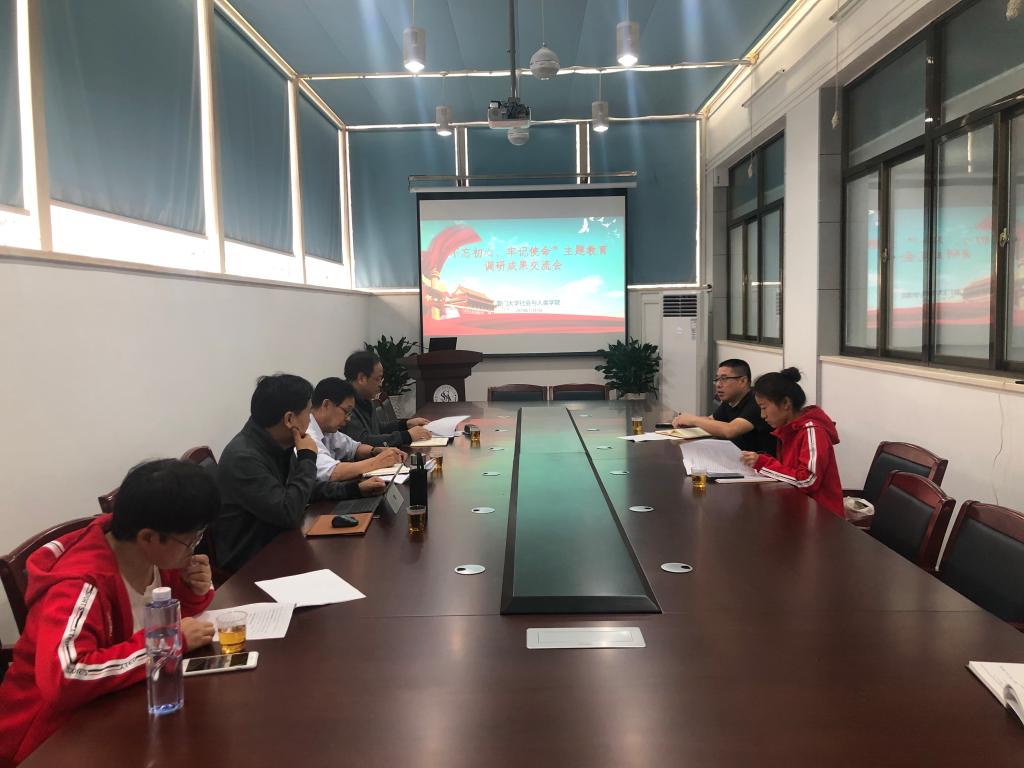 11月1日上午10时,学院在曾呈奎楼B栋206会议室召开学院“不忘初心、牢记使命”主题教育调研成果交流会。学院党委书记谢银辉,院长胡荣,党委副书记陈夷、毛毛,副院长徐延辉等学院领导班子成员,学校主题教育第五指导组组长杨敬达出席。交流会由谢银辉主持。