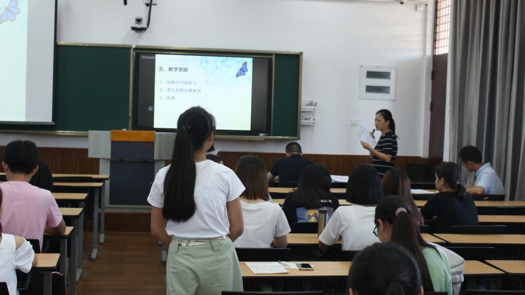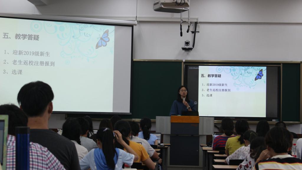 教学秘书张灵和尹梦琴在会上特别强调了秋季学期老生的报到注册时间和请假流程,并和同学们开展了气氛活跃的现场互动,针对同学们提出的教学问题进行了一一解答。