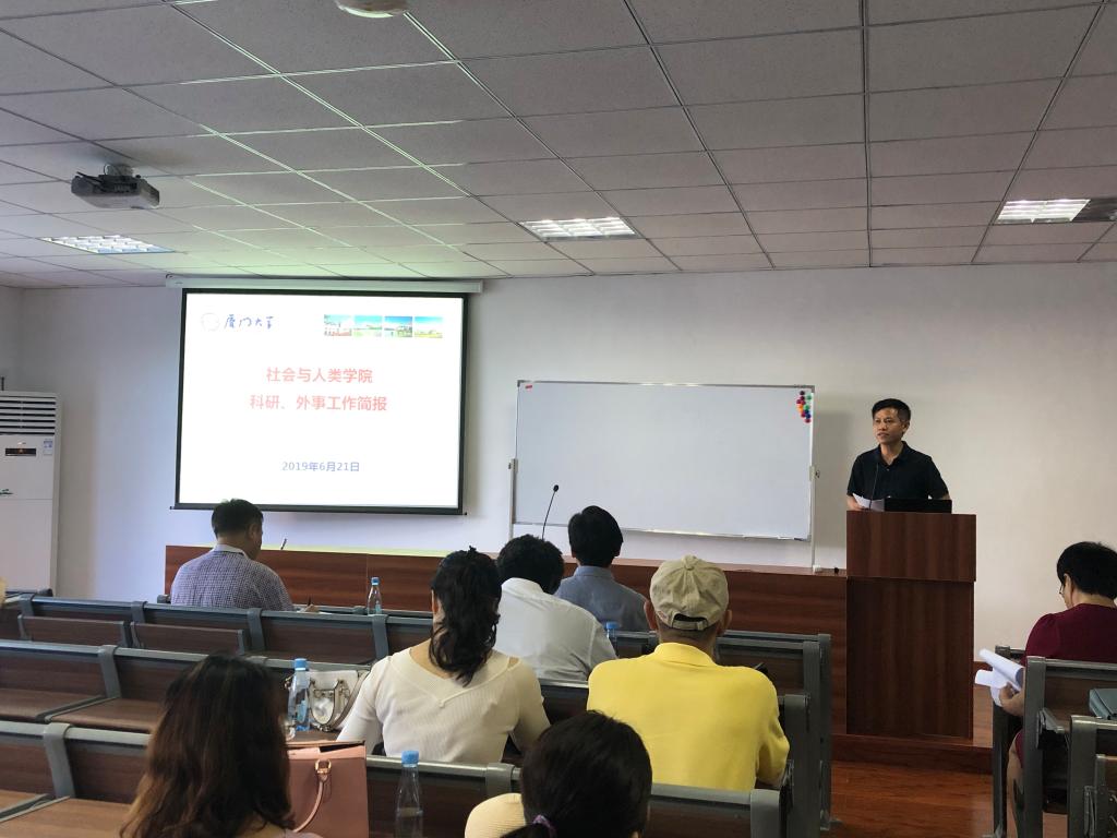 张先清副院长向大家介绍了学院近期科研项目申报工作概况,并对下学期科研项目申报的时间进度做了说明。他强调,学院未来在科研奖励激励机制做了计划和部署,鼓励老师发表高水平成果;学院还将加大对重大项目的培育建设,优化团队建设;学院将继续做好科研服务工作,优化科研环境与条件,营造良好的科研氛围,打造学院科研品牌。在外事工作方面,学院成功协助学校举办了世界人文学术会议,与加拿大卡尔加里大学社会工作学院开展交流座谈。张先清还就出国境审批程序和外事工作相关注意事项进行了重点说明,强调“外事工作无小事”,要求老师在开展对外交流时严格遵守外事工作纪律。