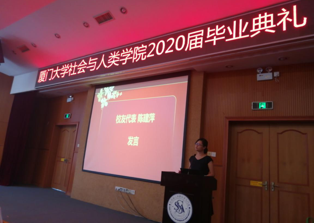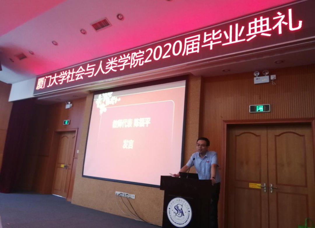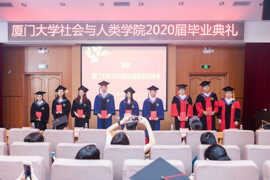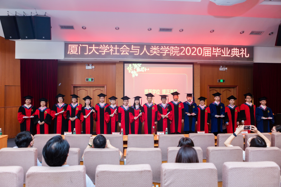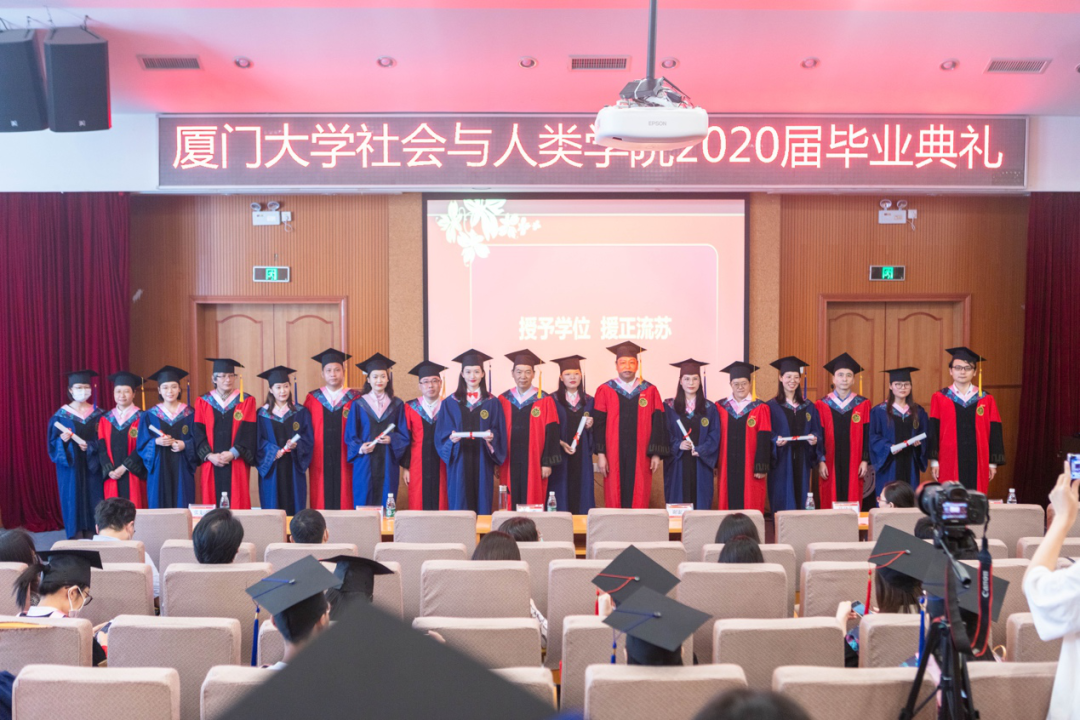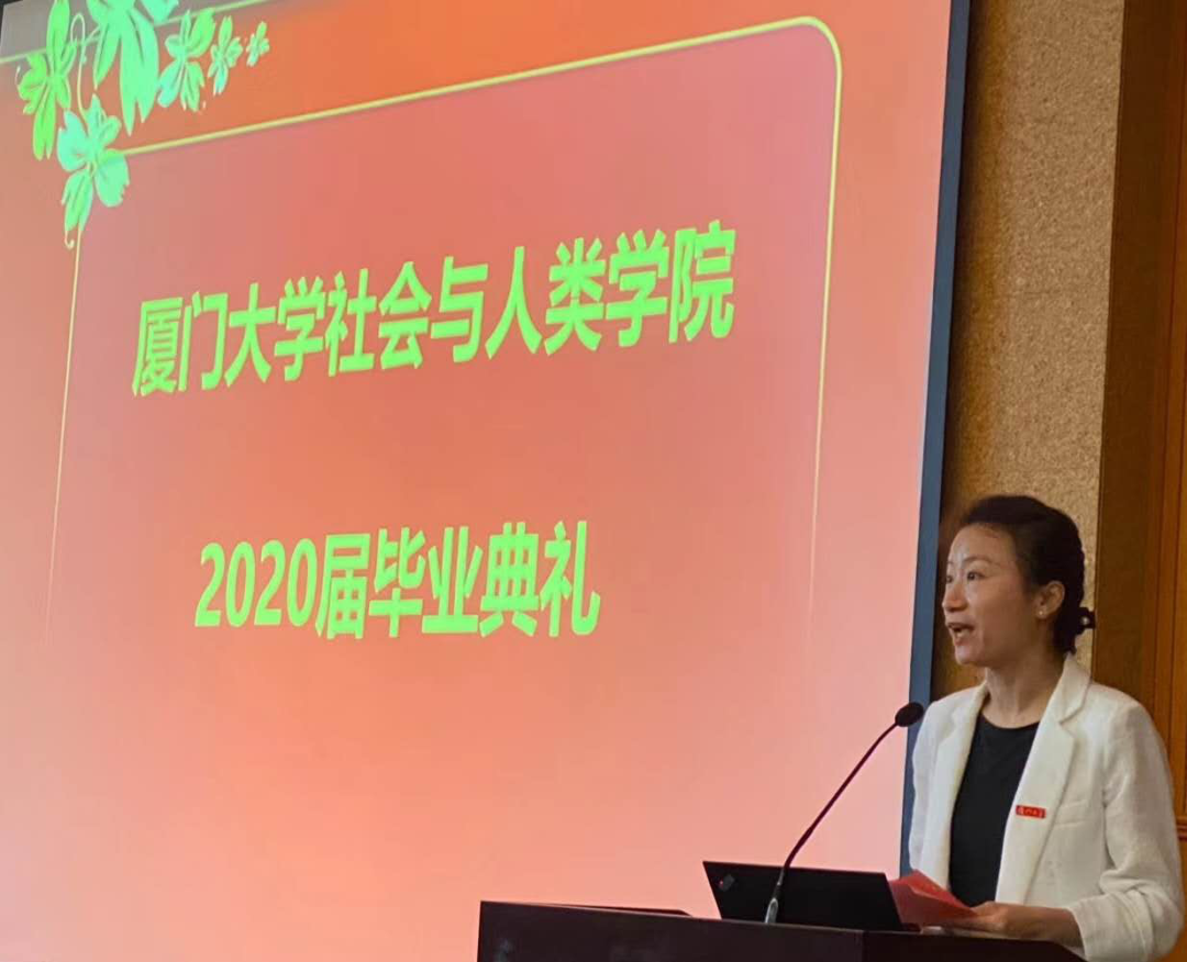 6月16日下午,社会与人类学院在化学报告厅举办2020届毕业典礼,学院党委书记谢银辉老师、院长胡荣教授、党委副书记陈夷老师、毛毛老师、副院长徐延辉教授、张先清教授等党政领导,校友代表、2015级社会工作专业硕士、厦门市莲前街道前埔北社区党委书记陈建萍学长,全体教职工和2020届毕业生们出席。典礼由学院党委副书记毛毛主持。