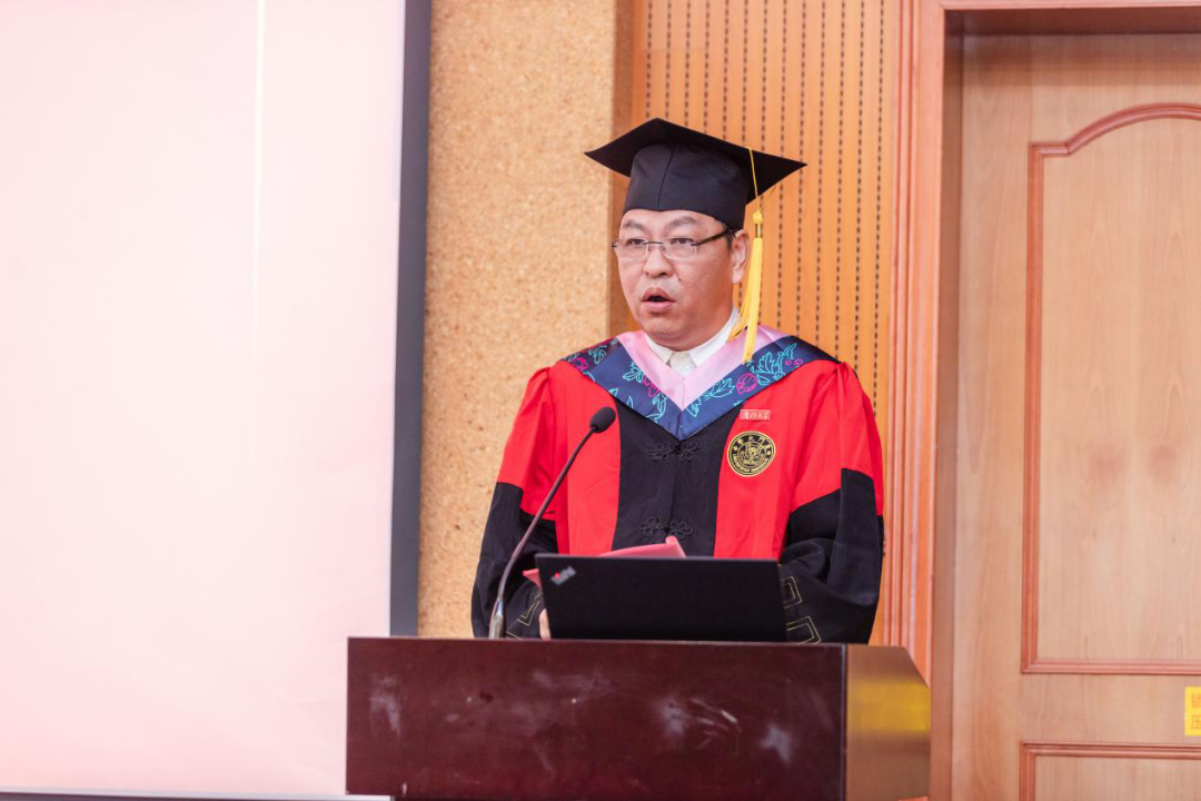 随后,学院党委书记谢银辉老师讲话,为毕业生们上最后一堂思政课,勉励同学们牢记习近平总书记给新时代中国青年的寄语:“坚定理想信念、站稳人民立场、练就过硬本领、投身强国伟业”,他叮嘱同学们:一要志存高远,永葆青云之志。不要在柴米油盐中消磨掉锐气,不要在日复一日中遗忘掉初心;二要脚踏实地,磨砺人生本领。在社会大课堂里,提升专业能力、打磨过硬素质。三要勇担使命,扛起复兴之任。用心中的光明和火焰,去照亮人生的道路,去传播宽厚的温暖,去建设祖国的明天,用实实在在的作为,担负起实现中华民族伟大复兴的中国梦的历史重任。