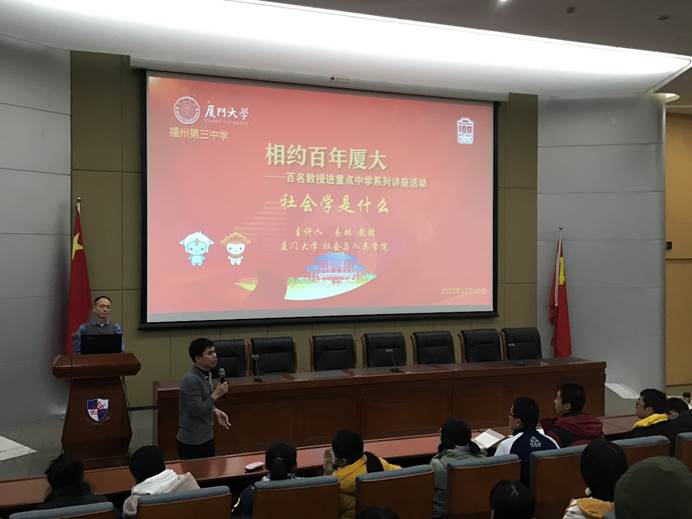 12月18日,“相约百年厦大——百名教授走进重点高中”系列讲座走进福建省福州第三中学。我院社会学系主任易林教授为福州第三中学的师生开展了一场主题为“社会学是什么”的讲座。