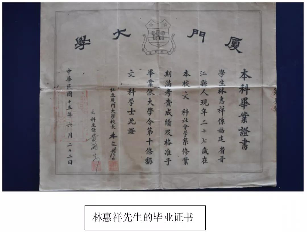 然而,我今天要请大家记住的这个人,却不是校主。因为我知道,校主已经深植每个厦大校友心中,不需我再多加提示。我要讲的是另一个人。很多人或许不知道,在厦大,除了校主陈先生,还有一位被称为“系主”的林先生。林先生的名讳是林惠祥(1901-1958),他和厦大的关系十分特殊。特殊到什么程度呢?厦大1921年创办,他是第一届入学的学生。虽然是预科,但赶上了母校的开学日,是第一批入学的厦大学子。苦读一年后,林先生从预科生转为正式生。再经过四年本科学习,1926年,林先生又赶上了厦大的第一届同学毕业,而且因为读的是文科,学校毕业公告以文科居首,他在同学录上被排在第一位,所以林先生的毕业证上就被编上了第一号,成为厦大历史上的第一位文科毕业生。