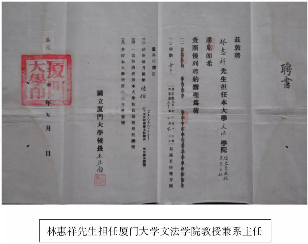 林先生出生于1901年,所以今年也是他的120周年诞辰。2011年,也是在厦大校庆90周年之际,为了纪念林先生诞辰110周年,我们组织召开了一次学术研讨会。林先生的女儿林华明女士,在和林先生遗孀黄老师及其他林先生子女商议后,将林先生的最后一批遗物悉数捐给了厦大。这里面不仅包括极其罕见的中华民国大学院聘书、中研院聘书、林先生的珍贵手稿等,而且还包括上述厦大毕业证书和历届聘书。我记得很清楚,林华明女士说,就让这批东西回到人类博物馆吧,因为她知道,这是林先生最爱的地方。这批林先生留给厦大的文物,怎么样才能衡量其价值呢?仅举一点,现在有多少中国的大学,还能拿得出它颁发的第一张毕业证书呢?但厦大拿得出!而且第一张毕业证书的持有者,又是林先生这样德才兼备的一代宗师。我想这应是厦大最值得骄傲的地方之一吧。可以说,林先生用他保存的第一号毕业证书,给母校的一百年华诞,献上了一份厚礼!
