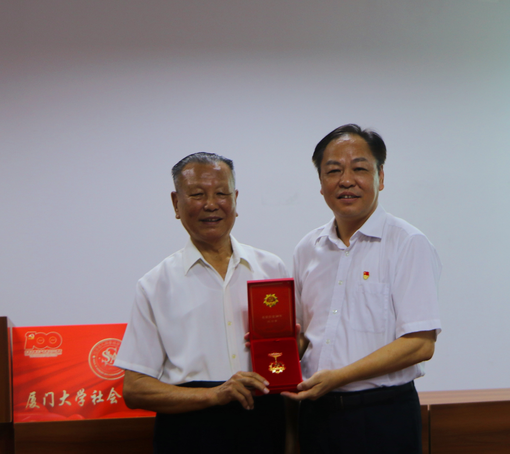 大会在雄壮的国歌声中拉开序幕。会议首先举行 “光荣在党50年”纪念章颁发仪式。谢银辉同志为人类学与民族学系教工党支部党员江炳荣同志颁发“光荣在党50年”纪念章,并郑重为其戴上纪念章。