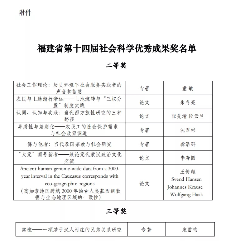 我院非常重视福建省社会科学优秀成果奖的评审工作,为了推荐更多更优秀的成果,我院积极动员每一位符合条件的教师申报,经过学院学术委员会预评审和组织申报交流会,最终共遴选10项成果上报。其中童敏老师的专著《社会工作理论:历史环境下社会服务实践者的声音和智慧》、张先清老师的论文《认同、认知与实践:当代西方族性研究的三种路径》、龚浩群老师的专著《佛与他者:当代泰国宗教与社会研究》、王传超老师的论文《Ancient human genome-wide data from a 3000-year interval in the Caucasus corresponds with eco-geographic regions》等4项成果荣获二等奖;宋雷鸣老师的专著《棠棣——一项基于汉人村庄的兄弟关系研究》荣获三等奖。