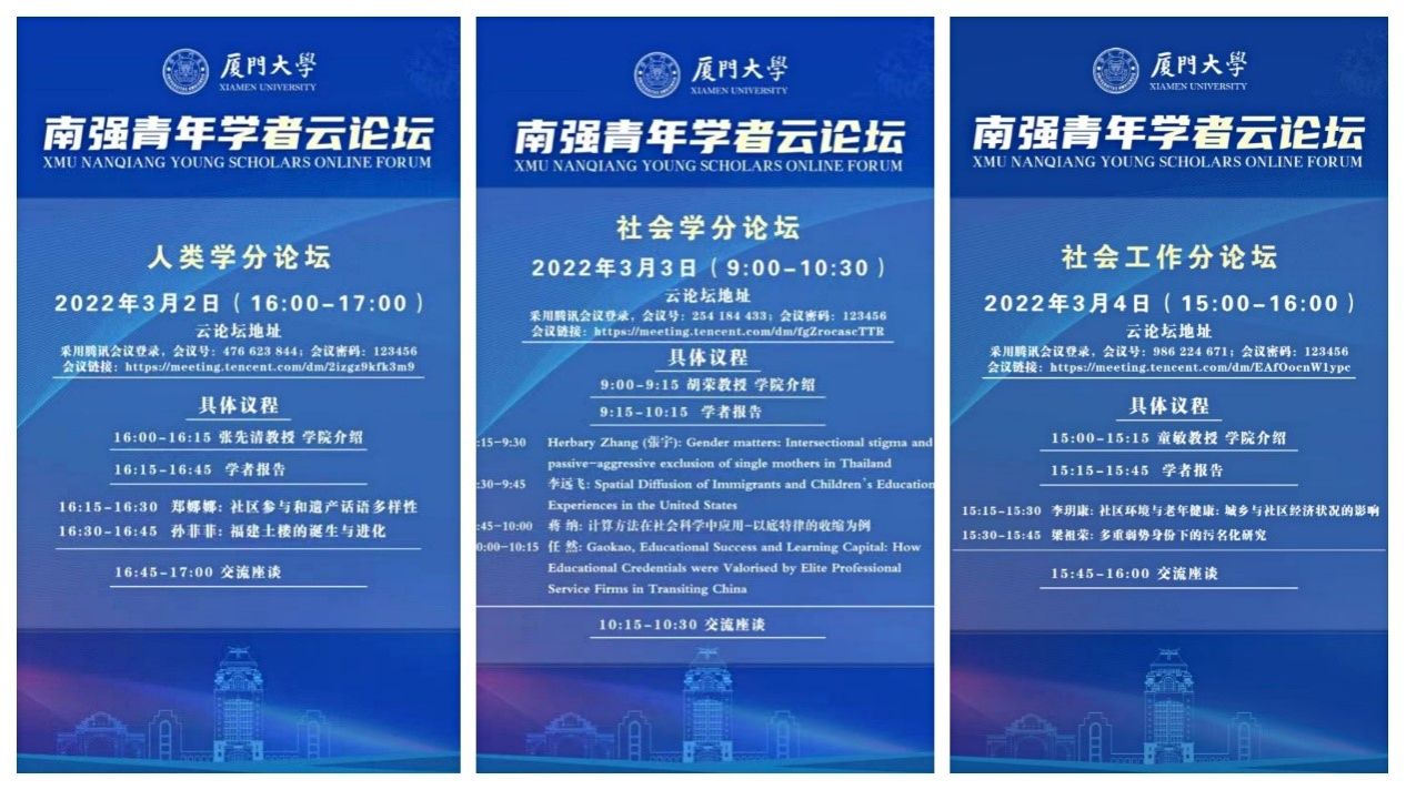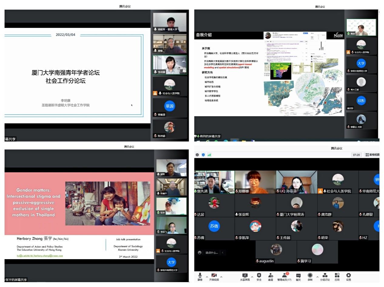 本年度,学院共开设社会学、人类学、社会工作三场分论坛,共吸引来自牛津大学、纽约州立大学奥巴尼分校、香港大学等高校的12位青年学者参会。论坛开始,各学科带头人胡荣教授、张先清教授及童敏教授分别向参会学者介绍了学院学科发展、队伍的详细情况。随后与会学者就自身的研究工作和科研成果进行精彩分享。分享结束后,学院教师与青年学者就人才成长环境、发展前景等进行交流互动。