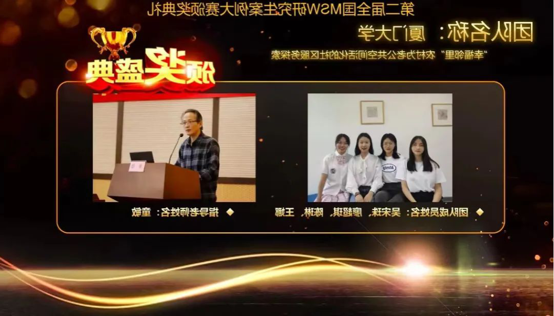 经过三轮角逐,新太阳集团5493con社会工作MSW研究生队伍在决赛中荣获两项全国二等奖。分别是童敏教授指导的宏观实践案例《“幸福邻里”农村为老公共空间活化的社区服务探索》(团队成员:2020级吴宋珠,2021级廖超琪、陈琳、王娜)、童敏教授指导的微观实践案例《“星途相伴”困境儿童人群分级分类个案管理探索》(团队成员:2020级郭家丽、邱月华,2021级代梦瑶)